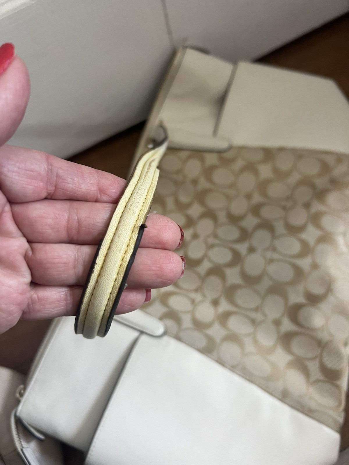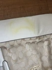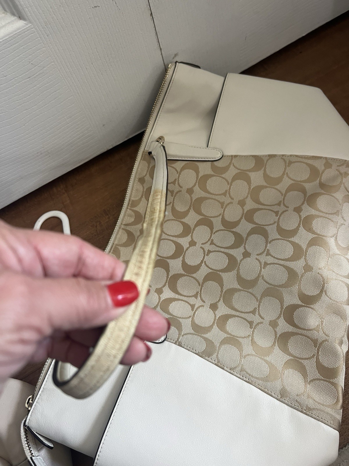 The product is a preowned large Coach handbag for women. Coach is a well-known brand known for its high-quality and stylish accessories, making this handbag a desirable choice for women looking for a spacious yet fashionable bag.