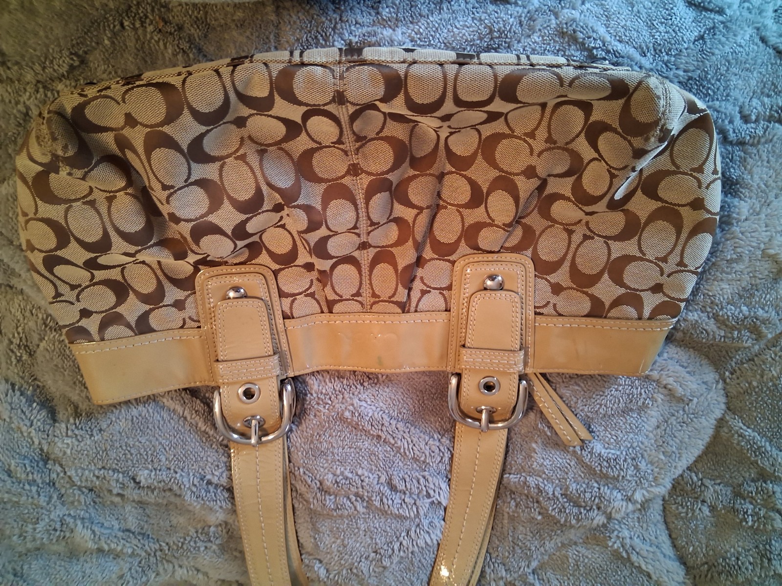 The product is a women's handbag by Coach, made of tan leather with a beige logo pattern. It features a zip closure, tote style, and is vintage. The handbag is lined with fabric and has leather handles/straps in beige color. The exterior is a combination of jacquard, canvas, and leather materials. This stylish and versatile handbag is perfect for carrying everyday essentials in a sophisticated and timeless manner.
