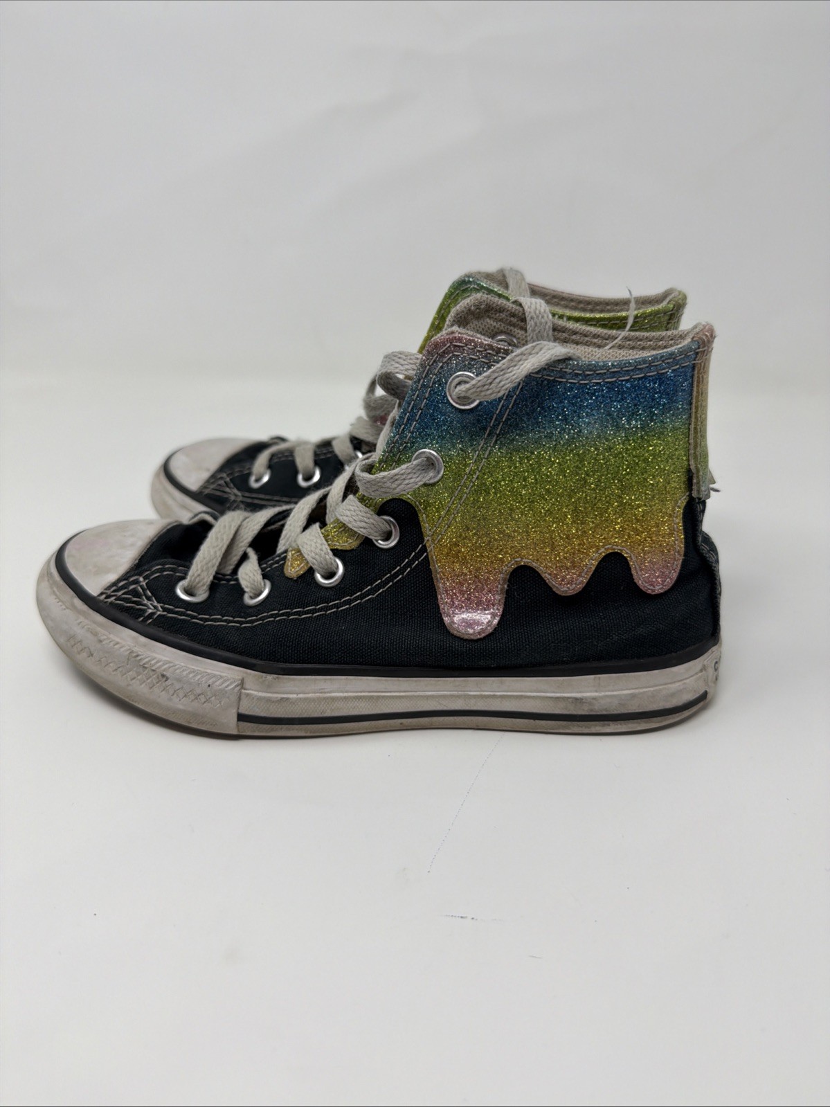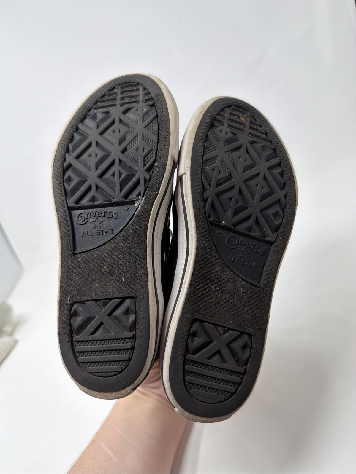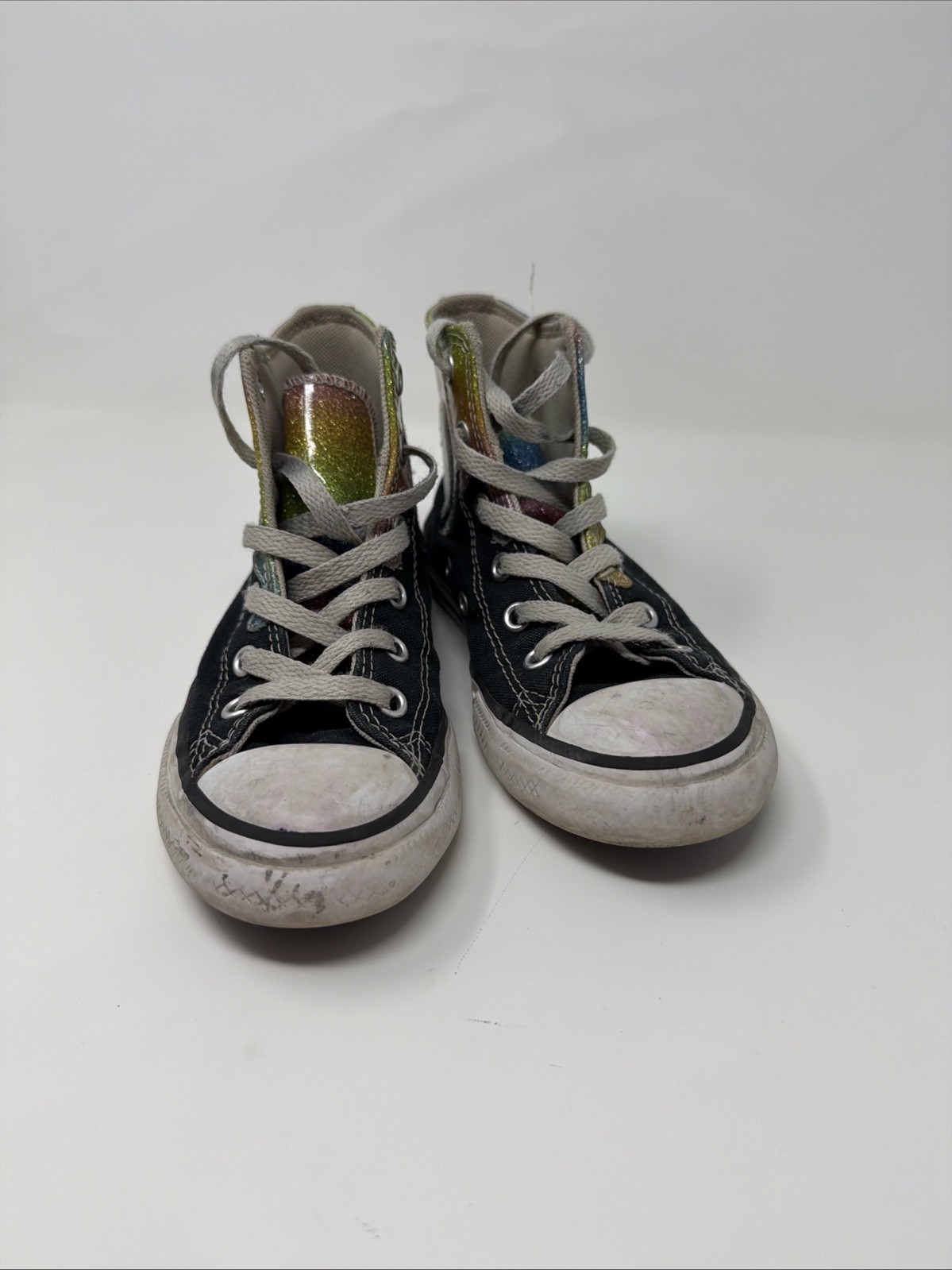 The product is a pair of Converse Chuck Taylor All Star high-top sneakers in black, designed for kids in youth size 13. These iconic shoes feature a round toe shape, lace-up closure, flat heel, and rubber outsole for comfort and durability. Perfect for casual wear in any season, these sneakers also offer minimal cushioning and are adorned with the Converse logo as accents. The unisex design and standard shoe width make them suitable for both boys and girls, while the high-top style adds extra protection and support. Made with canvas fabric and rubber lining, these Converse shoes are a timeless choice for active kids.