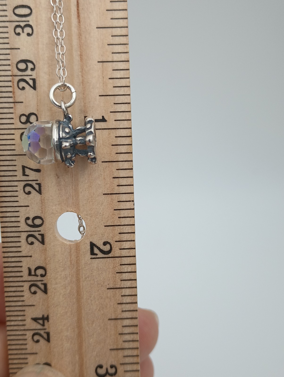 The product is a necklace with a charm style design, featuring a crystal ball. Made in USA this crystal ball comes with an 18" sterling silver chain. You can request a 24" chain. Please note; this crystal ball does change colors depending on the light.(this makes it very unique) Thank You for viewing!