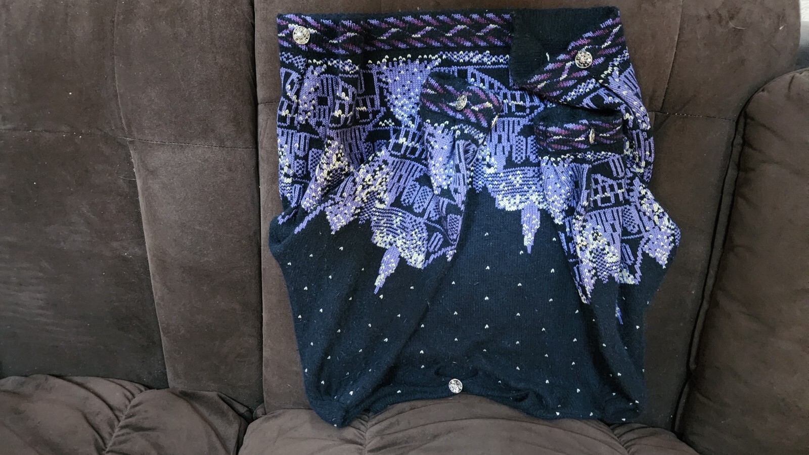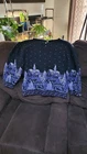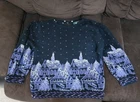 This black cullinane sweater in size M for women features a round neck and a winter town motif. Made with cotton, lambswool, and angora, this pullover style sweater is perfect for the winter season. The sweater has a designer, Christmas, holiday, outdoor, 80s, classic, and retro theme.