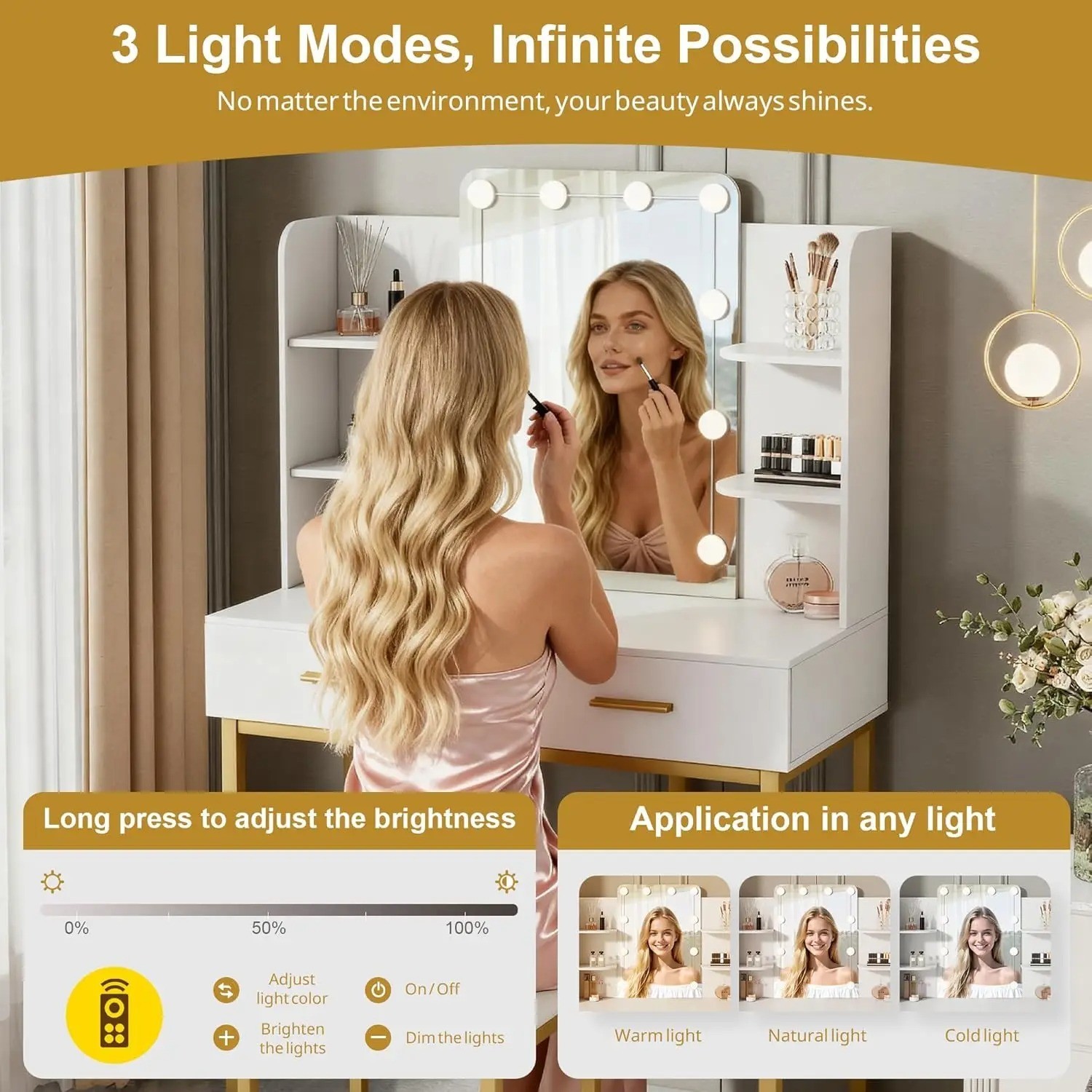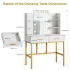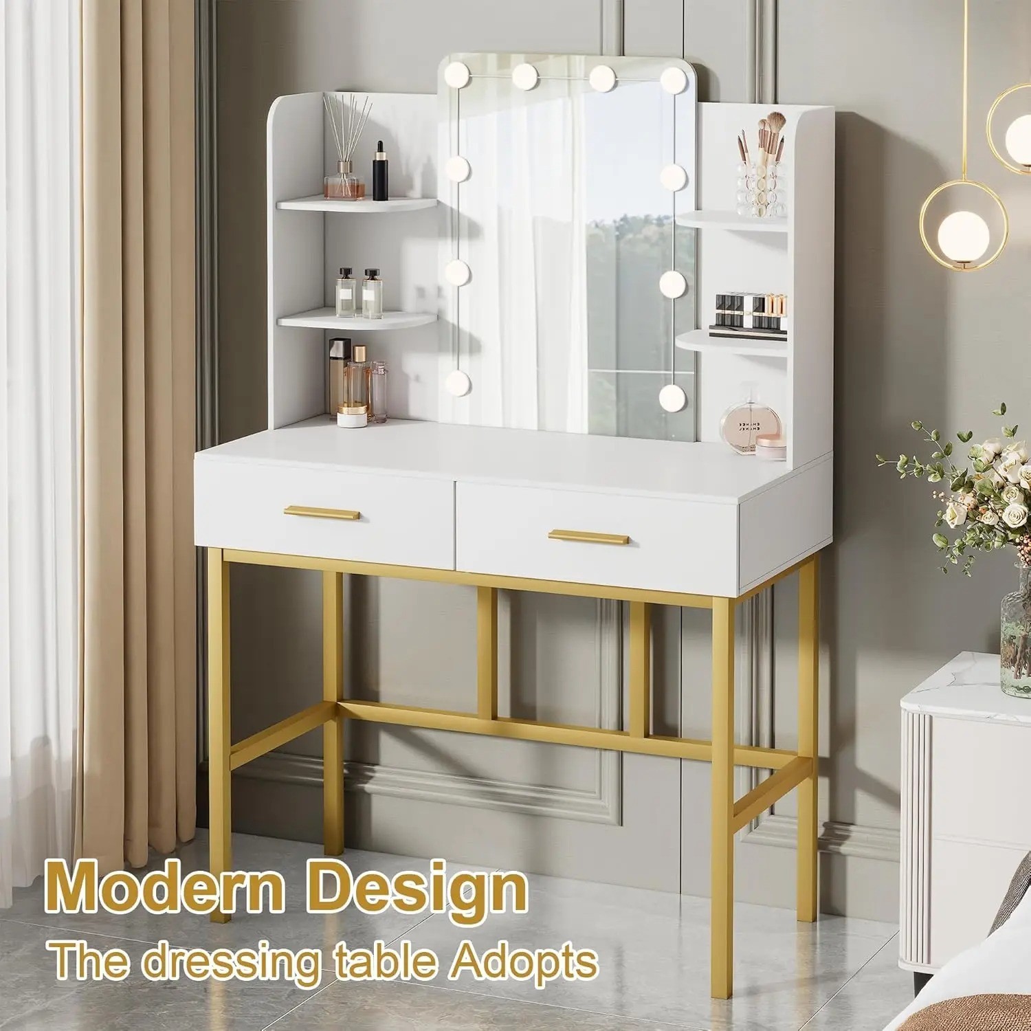 β¨ Modern Makeup Vanity Table with LED Mirror & Storage Upgrade your bedroom with this elegant and stylish modern vanity table set . Designed with both beauty and functionality in mind, this dressing table adds a luxurious touch to any space while keeping your cosmetics perfectly organized. π‘ HD LED Makeup Mirror The large high-definition mirror features built-in LED light bulbs, providing bright and even lighting for flawless makeup application. Perfect for daily beauty routines, skincare, and hairstyling. ποΈ Ample Storage Space 2 spacious drawers for makeup, jewelry, and accessories Open side shelves for perfumes, skincare, and decorative items Keep everything neat, organized, and within easy reach. π Sturdy & Stable Structure Built with a durable tabletop and strong golden metal legs, this vanity desk offers excellent stability and long-lasting use. The reinforced frame ensures reliable support for everyday use. π¨ Elegant Modern Design The clean white finish combined with luxury gold legs creates a contemporary and sophisticated look that matches any modern bedroom dΓ©cor. π Product Features: β Modern minimalist design β LED lighted mirror β 2 storage drawers β Open side shelving β Strong gold metal frame β Easy to assemble β Perfect for bedroom, dressing room, or apartment