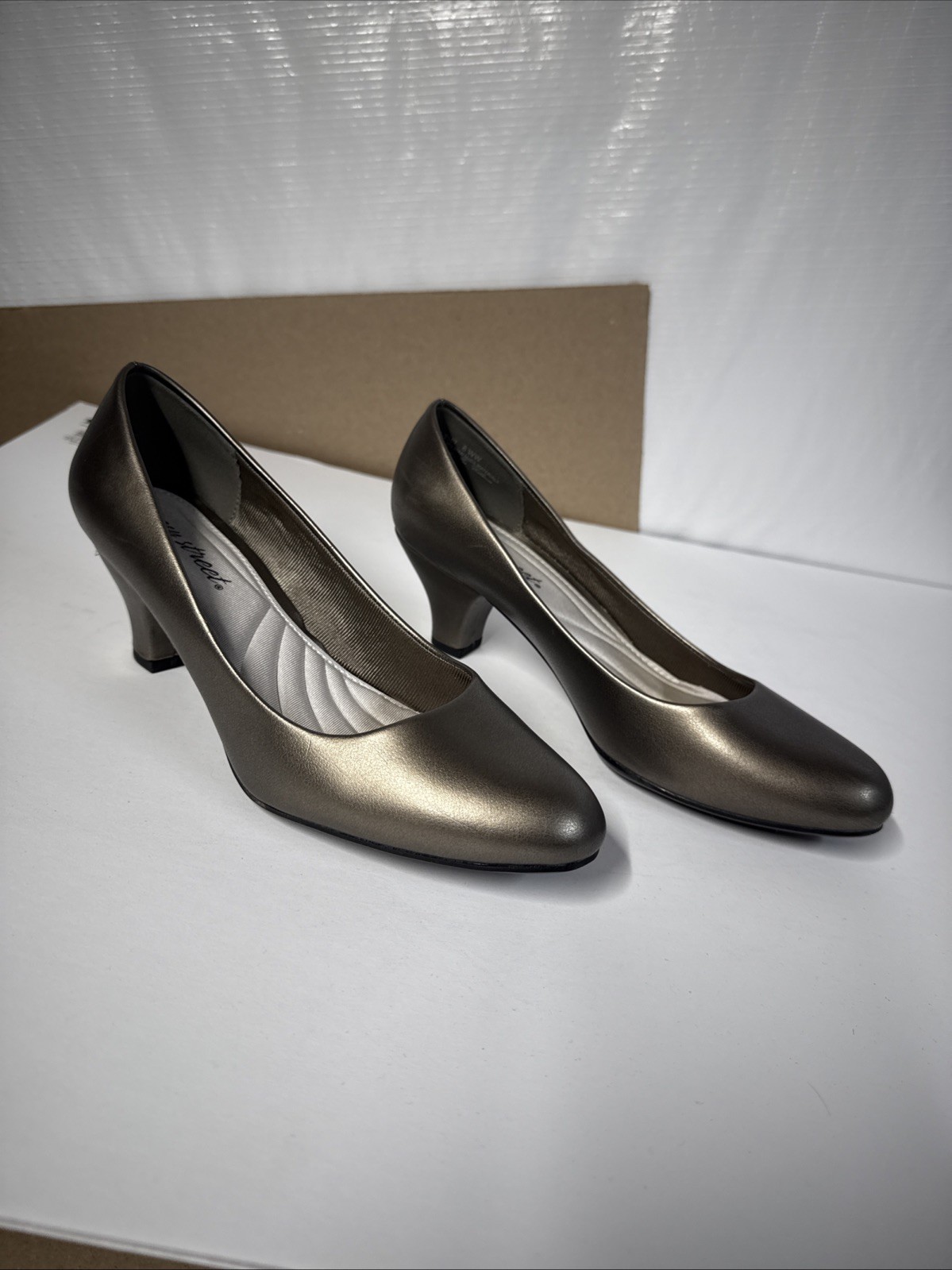 The Easy Street women's shoes in size 8 are stylish and comfortable heels with a round toe shape and a low wedge heel. Made from faux leather and synthetic materials in a sleek silver color, these pumps are perfect for adding a touch of sophistication to any outfit. The Easy Street brand ensures quality and durability, making these shoes a reliable choice for everyday wear or special occasions.