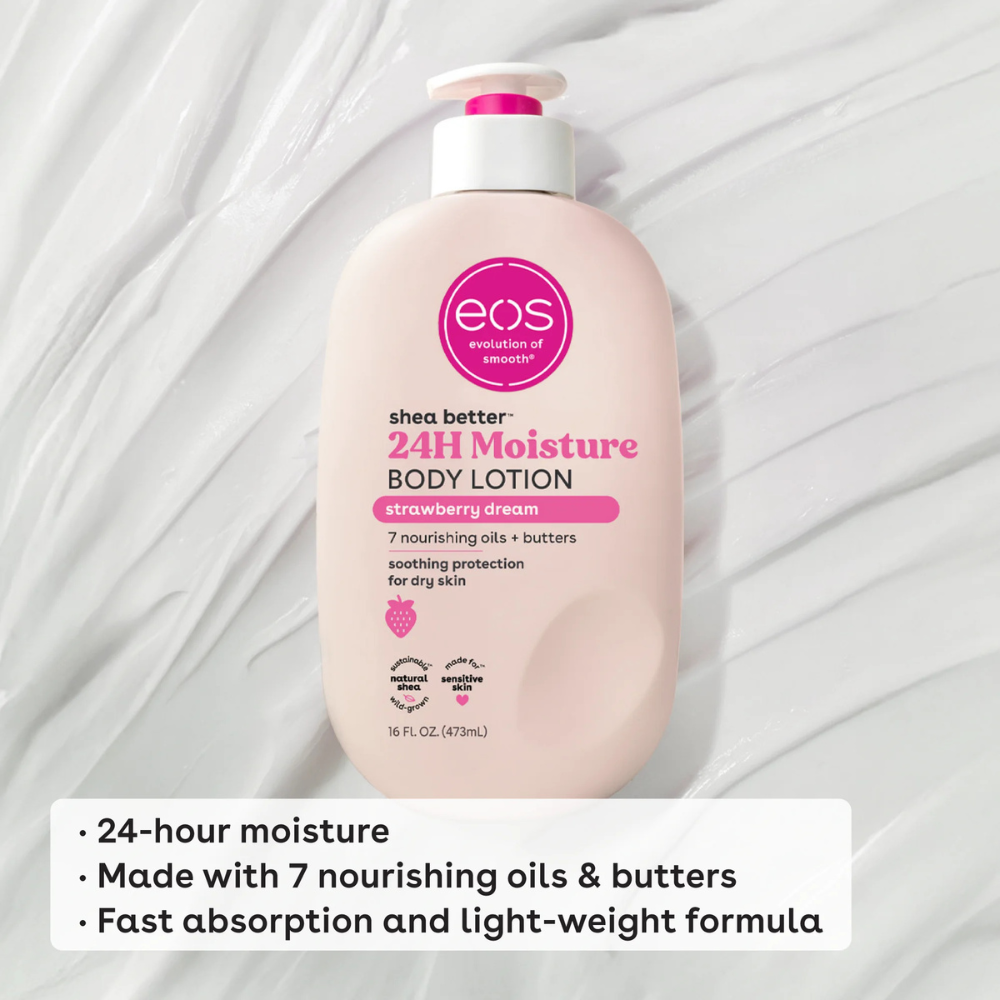 eos Shea Better Body Lotion for Dry Skin, Strawberry Dream, 16 fl oz, Best Price Our playful and delicious Strawberry Dream Body Lotion features notes of sparkling strawberry, pink sugar, and vanilla cream. eos 24H body lotion with instantly moisturizing Shea Oil + lasting protection Shea Butter quickly absorbs for 24-hour hydration. Say hello to… fast-absorption, lightweight, soft skin, and sustainable shea. Say goodbye to… greasiness, heaviness, and sticky residue. Apply this fast-absorbing and deliciously scented body lotion to just-cleaned skin, paying special attention to dry, rough areas. Relax – we’ll do the rest. STRAWBERRY DREAM: Features notes of sparkling strawberry, pink sugar & vanilla cream. 24-HOUR MOISTURE FOR YOUR BODY: Soothe and protect your skin with our lightweight and non-greasy lotion. No sticky residue or heaviness, just all-day hydration and smooth skin. SMOOTH ON: Apply this fast-absorbing and deliciously scented body lotion to just-cleaned skin, paying special attention to dry, rough areas. Relax – we’ll do the rest. SUSTAINABLE SKIN CARE: Protect and moisturize your skin with 7 nourishing oils + butters, including natural shea butter and shea oil. Our collection of incredible fragrances will delight in application and last all day on skin. ALL-NATURAL SHEA BUTTER: eos products have wild grown, sustainably-sourced 100% natural shea butter to make skin feel moisturized, protected and soft. We are paraben, phthalate and gluten free. Dermatologist-recommended. Vegan. Hypoallergenic. Cruelty-free. Shipping Policy FREE SHIPPING in all orders! Orders are usually processed and shipped out after 72 HOURS during BUSINESS DAYS (Monday to Friday) after payment has been received. But please be reminded that we are NOT processing and shipping orders during WEEKENDS and HOLIDAYS. Please make sure your ADDRESS is VALID for both UPS and USPS COURIER SERVICES. Please be reminded that costs incurred due to INCORRECT or UNDELIVERABLE ADDRESS should be shouldered by the buyer. The shipping services that we use are UPS, FedEx, USPS etc. We ONLY ship to the 48 STATES, NO APO/FPO ADDRESSES or PO BOXES. We DO NOT ship to warehouse, freight company. Local pickups and combined shipping options are NOT provided at this time. Return Policy DOMESTIC RETURN ACCEPTED - 30 DAYS. Contact us for more information. Payment Policy We accept payment by any of the following methods: PayPal Items can be returned for exchange or full refund WITHIN 30 DAYS from the date you receive your merchandise. We are not responsible for any purchase after this 30-day period. Feedback & Contact Us Customer satisfaction is very important to us. If you have any problem with your order, please contact us and we will do our best to make you satisfied. If you have any queries, please contact us via Ebay. We usually respond within 24 hours on weekdays. Thank you for shopping at our store.