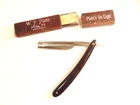 Here is an older extra Hollow Ground straight razor (etched on the face of the blade) and marker W.H. Morely & Sons, Clover Brand, Germany. The razor measures about 6 1/2 inches long. The blade itself measures 5 1/2 inches from tip to tip and is 5/8th inches wide. The razor shows signs of normal use with some wear, dirt scratches, and staining. There is some light wear on the handle, but no breaks or chips noted The box shows some wear and is not original to the razor. Please see the pictures and ask any questions. Thank you for looking. (Inv 23,421)