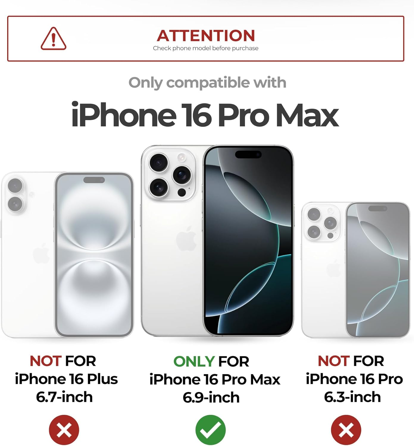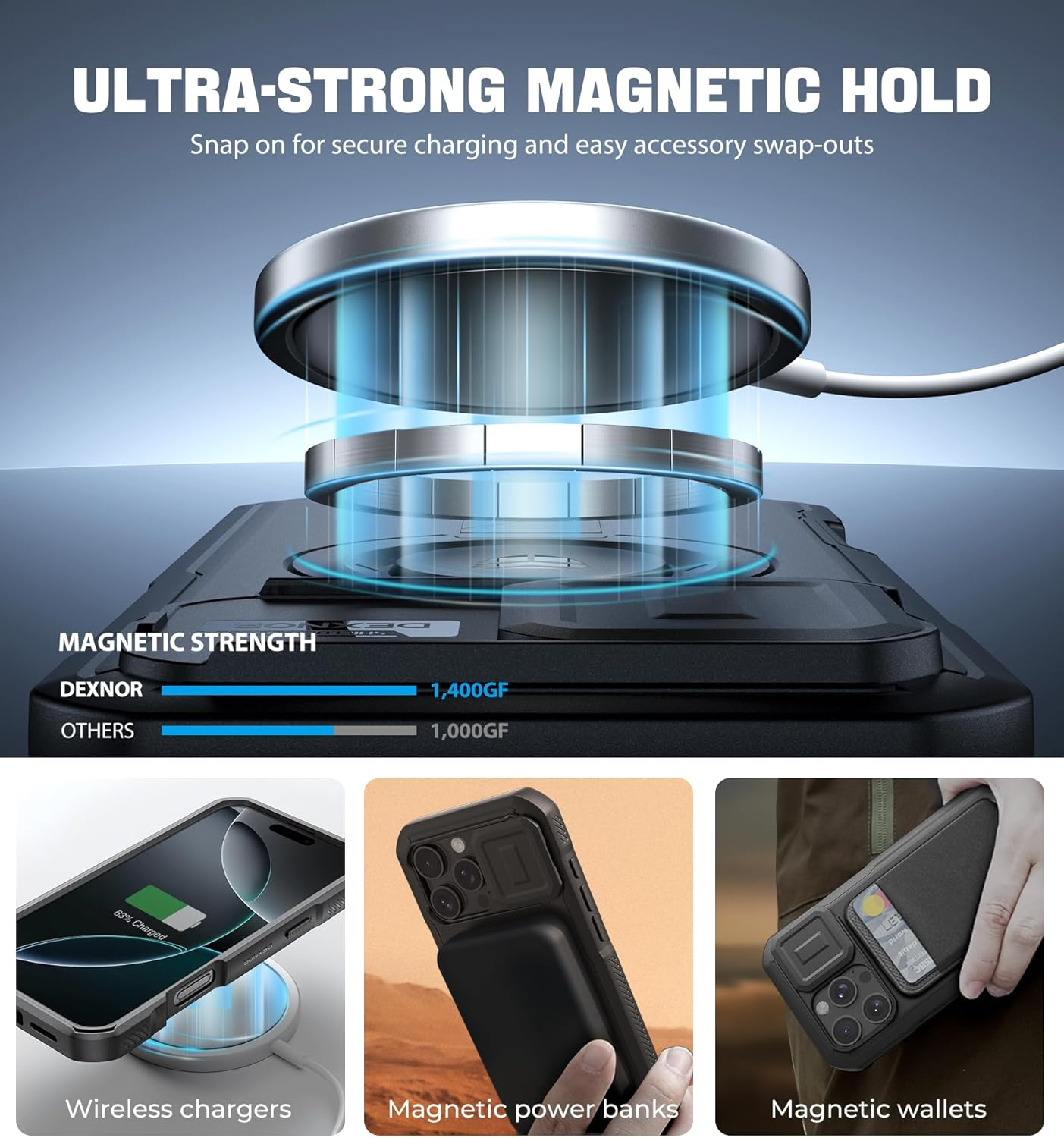 Store New Arrivals Add to Favorite View Feedback Contact for Iphone 16 Pro Max Case with Slide Camera Cover & Adjustable Kickstand & Built-In Screen Protector,Compatible with Magsafe Shockproof Bumper Cases Heavy-Duty Magnetic Protective Cover,Black Description Item model number iPhone 16 Pro Max Whats in the box Screen Protector Color Black Other display features Wireless Product Dimensions 7.32 x 3.74 x 0.67 inches Material Thermoplastic Polyurethane Compatible Devices iPhone 16 Pro Max Item Weight 2.4 ounces Special features Screen Protector Form Factor Basic Case Compatible Phone Models iPhone 16 Pro Max Size iPhone 16 Pro Max Pay attention to the Compatibility: This adventure-proof case is specifically designed for iPhone 16 Pro Max, offering precise cutouts for seamless access to all buttons and ports. Please check your phone model carefully before making the purchase. Mighty MagSafe power: With a magnetic hold of up to 1,400g, this rugged case keeps your phone securely attached to all MagSafe accessories. Whether it's a wireless charger or a car mount, it ensures your phone stays put and safe in any situation. Smooth slide camera cover: Designed with a sleek, easy-to-operate camera cover, this shockproof case not only offers exceptional protection for your camera lens from potential scratches and damage but also ensures privacy for those around you. Adjustable metal kickstand: Made from superior aluminum alloy, the adjustable stand is incredibly sturdy and long-lasting. It holds your phone securely in both landscape and portrait modes, ensuring great stability and convenience for hands-free viewing. Military-grade protection: Engineered with shock-absorbent TPU bumpers and a robust PC back, this bumper case safeguards your phone against drops and impacts even on the toughest trails, offering unparalleled peace of mind during outdoor adventures. Dual front frame options: The first frame comes pre-installed with a responsive PET screen protector, offering defense against scratches, dust, and spills. Alternatively, use the second frame with your own screen protector for personalized coverage. For every adventure: Dexnor is made for those who live for the great outdoors. It's your ultimate partner in rugged exploration. From mountain peaks to desert sands, Dexnor cases are built super tough to handle whatever challenges nature throws your way. Product description 1 Military-Grade Protection 2 All-Around Protection 3 Anti-Slip Design 4 Precise Cutouts ABOUT US We offer the best prices on a wide range of high-quality everyday products. Our store includes tools, home and kitchen essentials, kids’ toys, crafts and DIY supplies, party decorations, outdoor and household accessories, pet items, beauty and personal care products, and much more. SHIPPING We are always working hard to ensure your package arrives as soon as possible. Please understand that some factors like weather, high postal traffic, and the performance of shipping companies are outside of our control. We ship within 2 business days of payment, usually sooner. RETURNS We offer a 30-Day Return Policy on items which you are not completely satisfied with. You have the option for a full-refund or an exchange of the item. PAYMENT We accept PayPal. CONTACT US This page content is yet to come Please ad us to your favorite seller and visit again later Thank You CUSTOMER SATISFACTION We try our very best to make sure every customer is completely satisfied. If there's a problem, message us! We're happy to help. WE ACCEPT