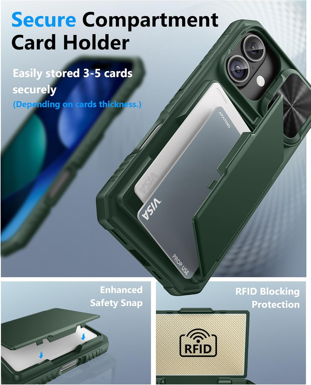 Store New Arrivals Add to Favorite View Feedback Contact Fast deliveries to the customer's home Quality customer service John Make the customers happy! for Iphone 17 Case, Built-In Card Holder (Store 3-5 Cards) [RFID] & Sliding Camera Cover, Military Grade Protection, Heavy Duty Sturdy Durable Wallet Cover Case for Iphone 17 6.3" 2025, Green Description ✅【Compatible with iPhone 17 Only】This wallet case is only compatible with iPhone 17 6.3" 2025. ❗Notice: ①To confirm your device model, go to: Settings → General → About → Model Name. Please double-check your model before ordering. (❌NOT fit for iPhone Air, iPhone 17 Pro, iPhone 17 Pro Max.) ②❌Not Support Wireless Charging, ❌Not Suitable for Lens Protetor ✅【Carry Light, Safe Life】Tired of bulky wallets and card loss? The card holder inside the iPhone 17 case securely holds 3 to 5 cards. Only need to take your phone when you go out, say goodbye to bulky wallet, and easily fits in your pocket! In addition, the RFID blocking technology that comes with the iPhone 17 wallet case will guard your payment and identity information, allowing you to enjoy the convenience of technology while staying away from the worry of information leakage ✅【Sliding it! Protect Camera Lens】Protect your lens in a snap! The camera cover of the iPhone 17 phone case adopts a safe dual-rail design. A gentle push locks in full protection, keeping dust, fingerprints and knocks away from expensive camera lenses. When you need to take a picture, gently slide it open to instantly capture a clear moment, protect and shoot, switch with ease ✅【Military-Grade Drop Protection】Total peace of mind against accidental shocks and drops. High durability protection thanks to its 360° airbag structure and highly resilient polycarbonate edges minimizing impact on all corners. It rigorously tested to withstand at least 10,000 drops from different heights. This case for iPhone 17 also features raised edges wrapped around the cameras and screen bezel, showcasing meticulous protection in every detail ✅【Ultimate Grip & Precise Cutout 】The edges of the i Phone 17 case are soft and flexible polycarbonate, which is comfortable to touch. The unique texture design on both sides of the case greatly enhances the grip. The iPhone 17 cover comes with precise cutout and easy-to-press buttons to enjoy all the functions of your phone Product description This Wallet Case is Only Compatible with "iPhone 17"! The video showcases the product in use. The video guides you through product setup. The video compares multiple products. The video shows the product being unpacked. iphone 17 case Merchant Video What's in the box? Does it support wireless charging? Our iPhone 17 case will come with 1 pc standard phone case and 1x manual. The iPhone 17 wallet case does NOT support wireless charging. Can I install the glass lens cover and phone case for iPhone 17 at the same time? No, actually our iPhone 17 case with slide lens cover, it can fully protect your lens. And you don't need to install additional lens protector. Installing both at the same time can damage the lens. How many cards does the i17 wallet case store? 3-5 pcs cards and a few sheets of cash. It depends on the thickness of the card and the money. Is this phone case compatible with other models except for the iPhone 17? Not compatible with other models. It is compatible with iPhone 17 6.3" 2025 in ONLY. How is the grip on the phone case? The phone case features a textured grip design along the edges, providing a strong, secure hold that prevents slipping. More iPhone 17 Phone Cases Add to Cart Add to Cart Add to Cart Add to Cart Add to Cart Add to Cart Add to Cart Customer Reviews 4.5 out of 5 stars 2,071 4.5 out of 5 stars 2,071 4.5 out of 5 stars 2,071 4.5 out of 5 stars 2,071 4.5 out of 5 stars 2,071 4.5 out of 5 stars 2,071 4.5 out of 5 stars 2,071 Price $19.99 $ 19 . 99 $19.99 $ 19 . 99 $19.99 $ 19 . 99 $19.99 $ 19 . 99 $19.99 $ 19 . 99 $19.99 $ 19 . 99 $19.99 $ 19 . 99 Card Holder ✔ ✔ ✔ ✔ ✔ ✔ ✔ Slide Camera Cover ✔ ✔ ✔ ✔ ✔ ✔ ✔ Military Grade Drop Protection ✔ ✔ ✔ ✔ ✔ ✔ ✔ Wireless Charging ✘ ✘ ✘ ✘ ✘ ✘ ✘ Color Green Black Blue Dark Purple Rose Gold Hot Pink Red Item model number iPhone 6.3 Whats in the box Card Holder Color Green Other display features Wireless Material Polycarbonate, Silicone Compatible Devices iPhone 17 6.3" 5G (Released in 2025) Item Weight 3.2 ounces Special features Card Slot, Heavy Duty Protection, RFID Blocking Protection, Screen Raised Edges Protection, Slide Camera Cover Package Dimensions 7.05 x 3.58 x 0.75 inches Compatible Phone Models iPhone 17 6.3" 5G (Released in 2025) Size iPhone 17, 6.3" ABOUT US We offer the best prices around on high quality products. Our E-store includes media such as books, movies, music and games while offering electronics, toys, sporting apparel, clothing, tools, general home, garden items and more. SHIPPING We are always working hard to ensure your package arrives as soon as possible. Please understand that some factors like weather, high postal traffic, and the performance of shipping companies are outside of our control. We offer free shipping to the lower 48 states and ship within 2 business days of payment, usually sooner. We do not accept P.O. Boxes. Please provide a physical address. For shipping outside of the continental USA, we only use eBay's Global Shipping Program. The item is shipped to KY and then sent to the rest of the world. International customers are responsible for all duties and taxes. Continue to 'check out' to calculate costs for shipping the item to your country. Messages regarding eBay's Global Shipping Program MUST be directed at eBay EXCLUSIVELY. RETURNS We offer a 30-Day Return Policy on items in which you are not completely satisfied with. You have the option of a full-refund or an exchange of the item. No returns are available on items shipped outside of the USA