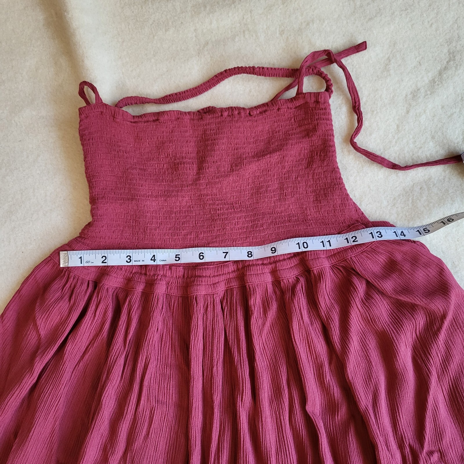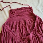 free people maxi dress size small, Sleevless, very Long Boho Gypsy Skirt subtle high low ruffle hem, raspberry color, pink red mauve, tie around neck, no holes or obvious stains, please see pics for measurements and condition, pre owned