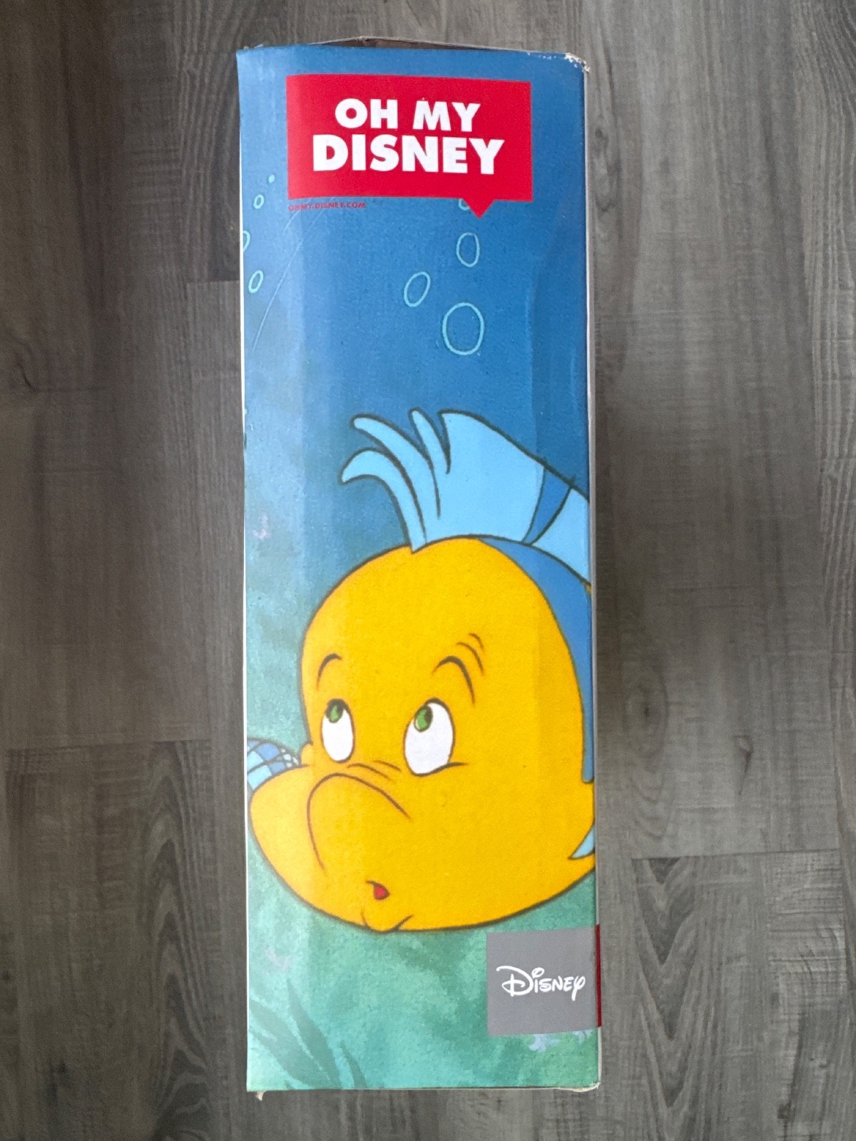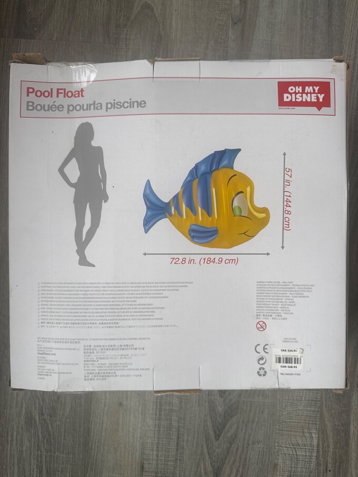 The product is a giant inflatable pool float featuring Ariel’s iconic Flounder from Disney's The Little Mermaid. Made by Disney in 2012, this multicolored float is suitable for various age levels, from 3 years and up. This pool float brings the magic of the ocean to life, making it a fun and whimsical addition to any outdoor swimming experience. Made in China, this float is sure to delight both children and fans of the beloved Disney movie.