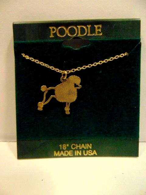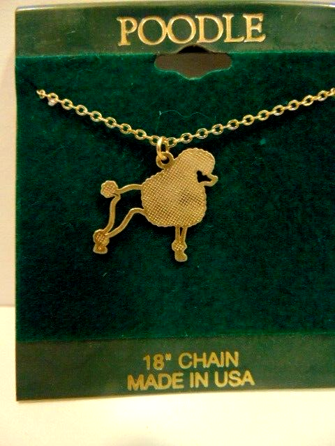 Here is an " old store stock" gold color Poodle dog shaped pendant on chain necklace. The chain is 18 inches long. The necklace is unused and was purchased from a business that closed. The pendant is about 7/8th inches wide. The display card is about 2 1/2 X 2 3/4 inches. Please see pictures and ask any questions . Thank you for looking. (Inv 28,6 )
