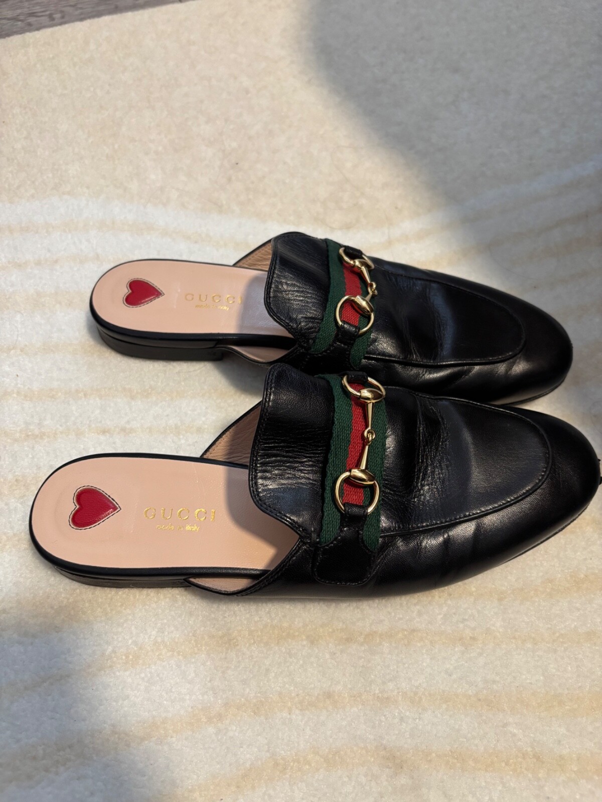Black leather with tonal piping Women's Green and red Web Horsebit detail Leather sole Flat .4" height Made in Italy This style runs small, we recommend sizing up