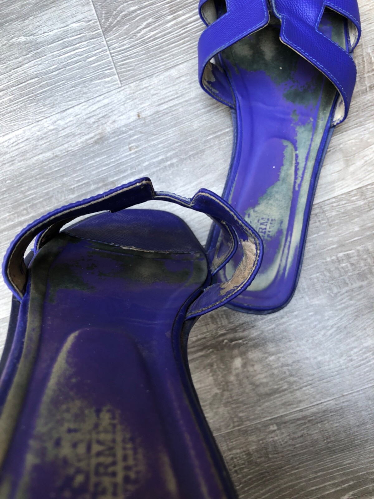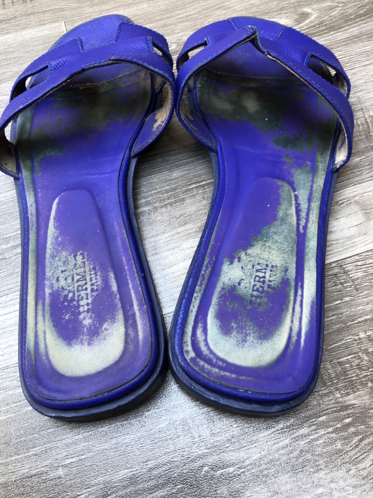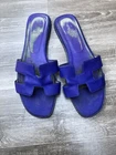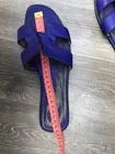 Elevate your summer style with these navy blue Hermes Oran sandals. Crafted with high-quality leather and featuring a flat heel, these sandals are perfect for any casual occasion. The slide style and UK shoe size of 6 make them easy to slip on and off, while the US shoe size of 39 ensures a comfortable fit for women. These sandals are a must-have addition to any fashion-forward woman's wardrobe. The elegant design and high-end material make them perfect for any occasion, whether you're dressing up or keeping it casual. Don't miss out on the opportunity to own these stylish and timeless sandals.