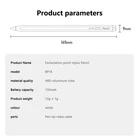 Features: The exclamation mark patented power display universal active capacitive pen is made of wear-resistant POM material, and the replaceable aluminum shell is frosted and sprayed with a better feel. Charging port: Type-c charging port with dust cap added Delay: 6 milliseconds Pen tip: pre installed special conductive pen tip, with 2 spare pen tips Material: Metal shell spray coating process, extremely soft feeling Connection: Direct use of pen tip when turning on: 1.6mm PIXELPOINT Size: 163mm long, 9.1mm diameter D-shaped pen tube, with the thinnest part only 8.3mm Weight: 70g Box gauge: 45 * 36 * 32.5CM Gross weight: 7.1KG/100pcs Charging time: approximately 1.5 hours Working time: can work for 18 hours after full power Standby time: When the battery is fully charged, it can stand by for up to 2 years Compatibility: Suitable for most capacitive screen devices System: Suitable for most capacitive screen devices Accessories: pen refill * 2, data cable * 1, instruction manual * 1 Outstanding point: Pre installed special conductive pen tip, replaceable pen tip, suitable for most capacitive screen devices