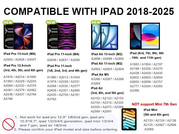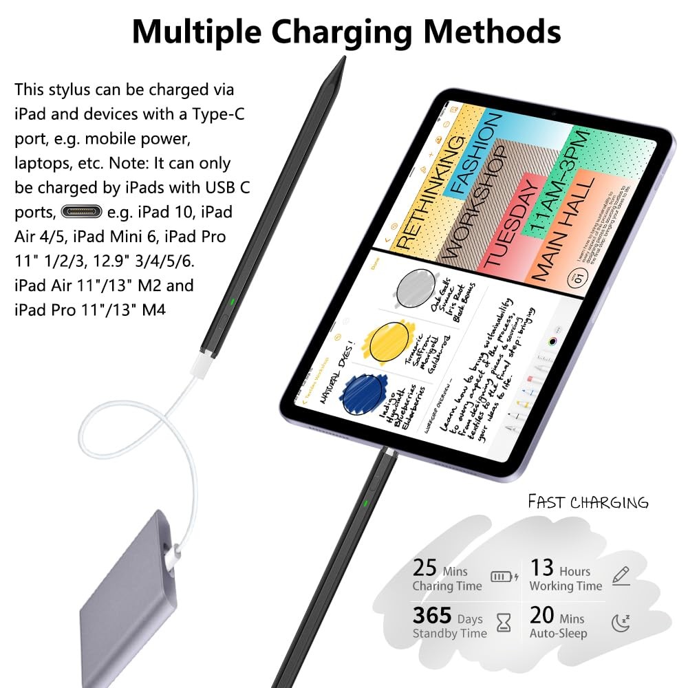 Stylus Pen for iPad 2018-2025 In many ways this pencil for iPad is better than the original pen, for example: * Button Switcher for Simple Start No Bluetooth or App required to connect, you can use this stylus directly by pressing the button. *RGB Indicator for Real-time Power Display There are 3 colours of light change to remind you the battery level. Green Light: Power 70%-100% Blue Light: 40%-69% Red Light: 5%-39% The stylus will automatically switch off when idle for more than 20 minutes. *25 mins Fast Charging & 13 hrs Working Time Built-in 160mAh battery, therefore this pencil for ipad can work with you for a long time. You can use it to draw, take notes, record, color, sketch, study(online schooling), work use. * 4 Nib for Longer Usage A POM nib can write 13 kilometres (twice the range of a regular nib). Also, the original nib can be used. * Universal USB C Charging This pencil for ipad is charged by a usb c cable, so you can charge it via most of usb c devices, eg: latops, power banks, ipad with usb c pork and so on. * High Quality & Affordable Price. The price is less than a third of the original pen, but it's function is powerful. This stylus pen for ipad is an ideal gift for your children or friends. SPECIAL FOR POST-2018 iPAD - iPencil is designed for 2018-2025 iPad models, ONLY compatible with New iPad Pro M4, iPad Air M2/M3, iPad A16, and iPad 6/7/8/9/10/11 Gen, iPad Pro 11" 1/2/3 Gen, iPad Pro 12.9" 3/4/5/6 Gen, iPad Mini 5/6 Gen, iPad Air 3/4/5 Gen. ***Confirm your iPad model before purchasing please. [Note: this stylus pen for ipad doesn't support pressure-sensitive and magnetic charging.] PRESS AND PLAY - Super easy to use, just press and play. pencil for ipad features a button switcher design, which prevents accidental touches and saves power. RGB Battery Level Indicator -- there are 3 colours of light change on the pen for ipad for a real-time view of power changes. Easy to carry and store that the stylus for ipad can be attached magenetically to the side of your device. USB C FAST CHARGING - With the same charging method as pencil 1st generation for iPad, stylus pen for ipad can be charged not only directly from your ipad, but also from other devices with USB-C pork, e.g. laptops or power banks. Fast Type-C charging in 25 minutes. Up to 13 hours of continuous use. Standby time up to 365 days. When lying idle for more than 20 minutes, the stylus pen for ipad will automatically power off. HIGH PRECISION & PALM REJECTION - This newest USB C ipencil 1st generation comes with 1.5mm fine nib, with pixel-level accuracy, offering the same writing experience as ipencil 2nd generation. 4 nibs are longer lasting. No glove required, palms can touch the screen with ease without fear of creative interruption. Perfect for online study, taking notes, working, drawing, recording, enjoying leisure. SENSITIVITY TO TILT - USB C pencil 1st generation for ipad can easily vary line thickness by changing its angle. Sketch, take notes, color, sign and record could be achieved by one stylus pen for ipad, no lag, low latency, effortlessly interacting with the iPad. It feels like a traditional pencil in your hand, but is more powerful, perfect for students, office workers, illustrators, artists, creatives. [Note: it doesn't support pressure-sensitive and magnetic charging.]