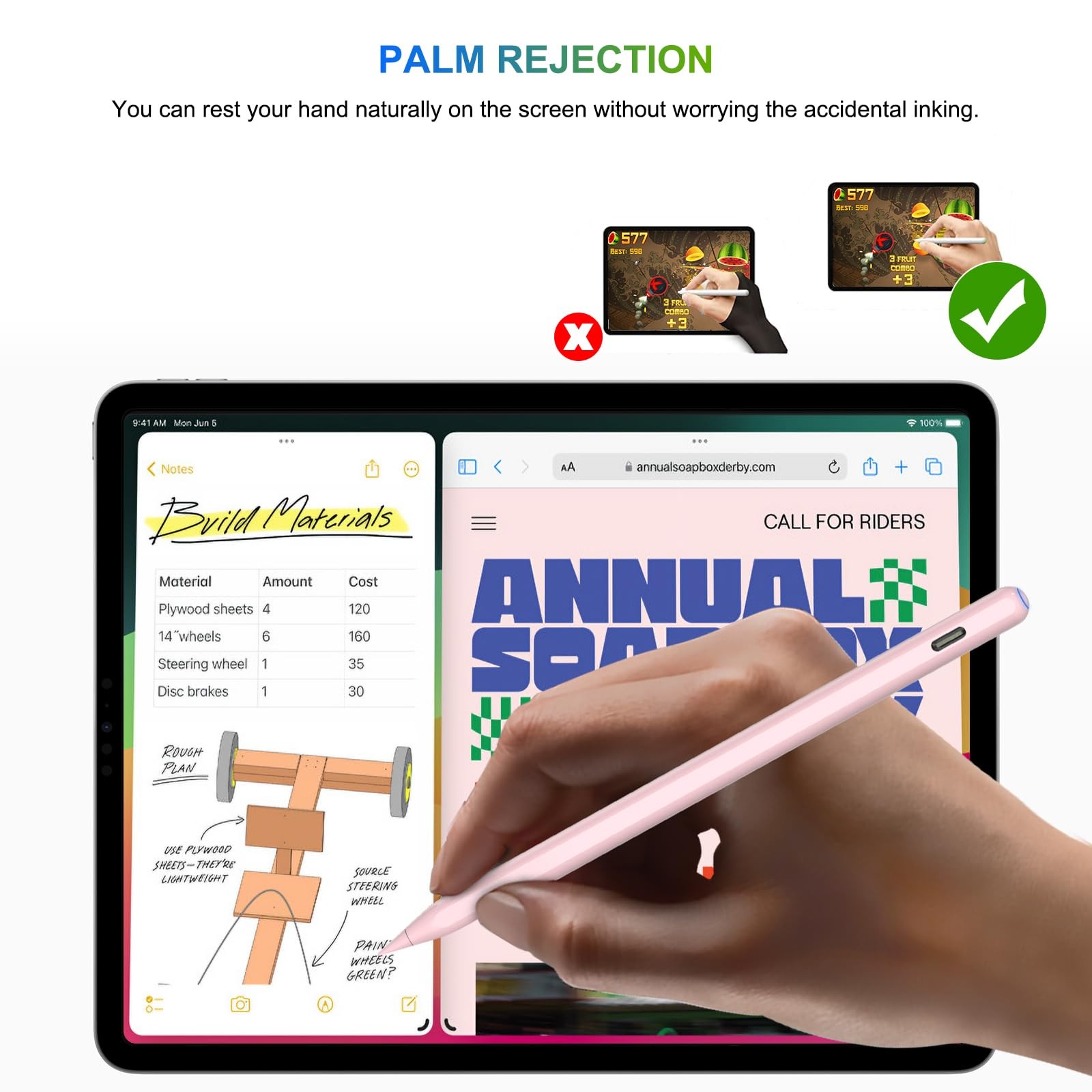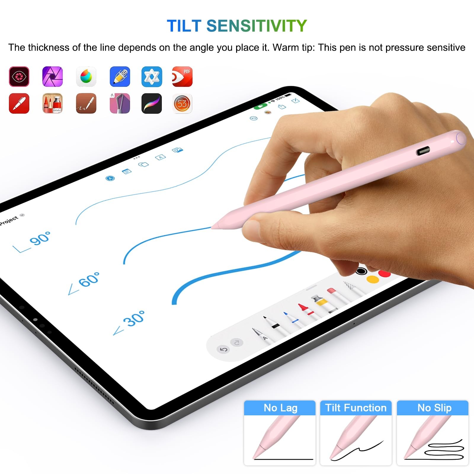 Pencil 2nd Generation Wireless Charging, Pencil for iPad with Tilt & Palm Rejection, Magnetic Stylus Pen Compatible with ipad Air 3/4/5, ipad Mini 5/6, ipad 6/7/8/9/10, ipad Pro 11/12.9 (Pink) MAGNETIC WIRELESS CHARGING + TYPE C QUICK CHARGING -- The upgrade of the pencil 2nd generation breaks through the new technology of wireless charging, which allows you to charge the pen for ipad by attaching it to your ipad. plus, we've added a USB-C quick charging port, USB-C charging in 30 minutes and the magnetic charging is fully charged in 1.5 hours allows 10 hours of continuous use and an intelligent shut-off after 5 minutes of inactivity. DESIGN FOR IPAD 2018-2025 - This pencil for ipad is compatible with ipad 6/7/8/9/10/11 generation, ipad Air (M3/3/4/5 generation), ipad Mini (5/6 generation), ipad pro 11"/12.9", this is definitely the best alternative to the pencil 2nd generation. Note: magnetic charging is only for ipad Air 4/5, ipad Mini 6, ipad pro 11/12.9 inch available. If you do not know how to confirm the ipad model number, please contact us. PALM REJECTION -- This pen for ipad 9 generation supports palm rejection, tilt and replace tips. No Bluetooth or app connection is required. Simply click the button above and make a Bluetooth connection to your ipad to write, draw, mark, sign and note with this ipad pen right on your ipad. But please note: this pencil has no pressure sensitivity. BATTERY LEVEL INDICATOR -- After our pencil for ipad 10 generation is connected to the ipad via Bluetooth, you can read the battery level in the status bar. There is also a power indicator for the ipad pen, which shows the battery level of the stylus pen for ipad: blue (working status), red (charging status) and green (fully charged). PACKAGE INCLUDES -- 1 x pencil 2nd genaration, 3 x repalceable tips, 1 x charging cable type C, 1 x user manual. We offer 24/7 online support and a 1 year warranty from date of purchase. If you have any questions about our pencil, we will make sure you receive a refund or a replacement.