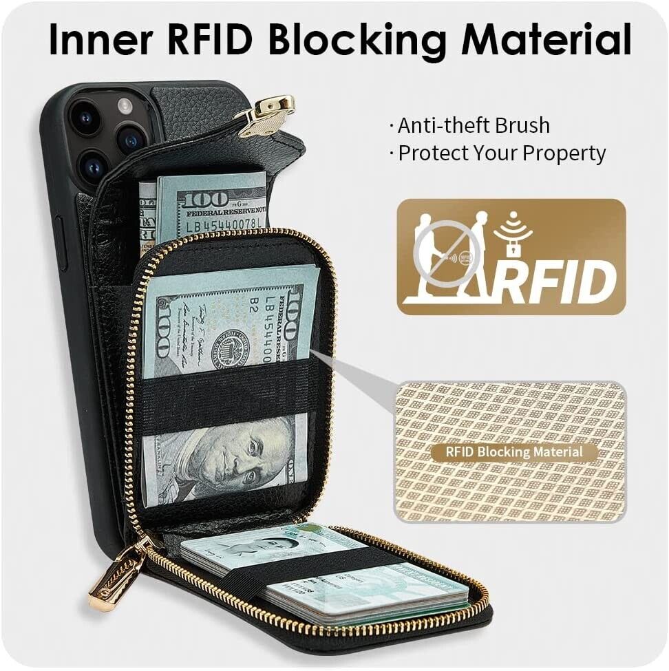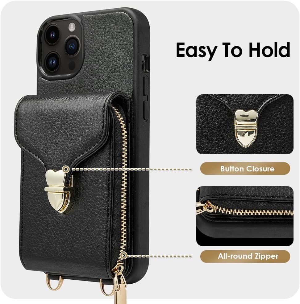 JLFCH ROMIELA Series iPhone 12 /12 Pro Wallet Case, Crossbody Chain Strap Case Zipper Leather Purse RFID Blocking with Card Holder Lanyard Women Protective for Apple iPhone 12 /12 Pro, - Black ★Compatible : iPhone 12 / 12 Pro wallet case, ONLY fit for Apple iPhone 12 /12 Pro. Notice:Please Double Check Your Phone Model Before Purchase. ★Button Closure : Make sure safety inside, Don't worry about forgetting or losing when you go out. ★ Card Holder : Can hold 10+ Cards/ID/Cash...Cute and Convenient Practical for using. ★Crossbody Strap & Wrist Strap : The length of the crossbody strap can be adjusted and taken off. It is perfect for travelling, simply going out or usual daily life. The chain strap length measures 52" ★Equipped with RFID : This Wallet Case is Equipped with RFID Protection Technology Against Credit /Debit Card Skimming Frauds.Give you the safest protection. It has a super long warranty period of 360 days. If you have any questions, you can contact us immediately.Your satisfaction is our ultimate goal.