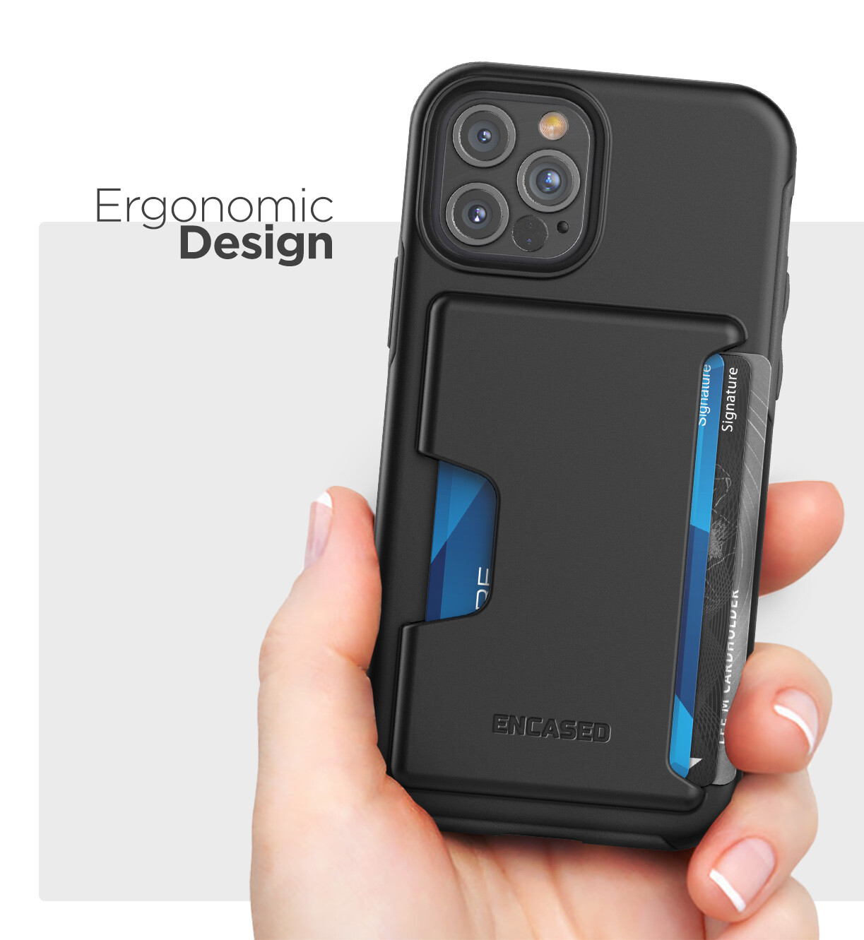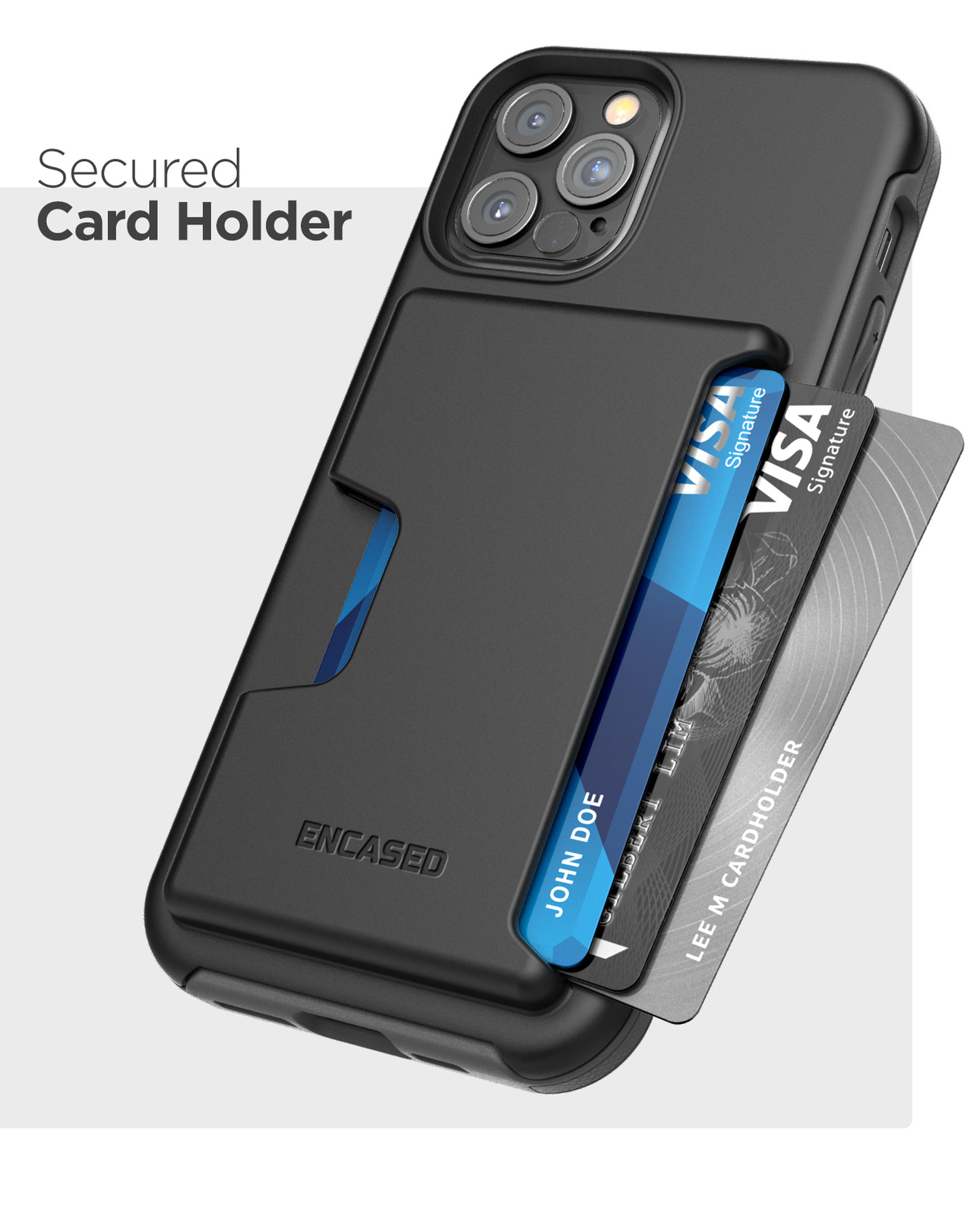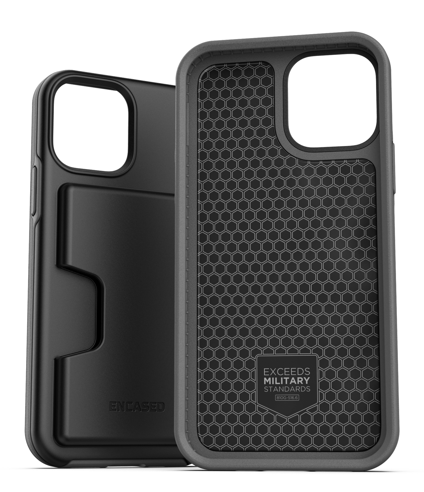 Features: The Phantom wallet case features a compact credit card slot that securely stores up to 4 IDs, credit or debit cards Ultra durable, dual layered design with shock resistant tpu sub frame and rigid PC shell for increased durability Raised screen lip and easy push buttons ensure comfortable and effortless functionality All new redesign for the new iPhone 12 Pro Phantom Series Wallet For iPhone 12 Pro Style + Protection The Phantom Wallet Series is constructed of a high-density polycarbonate material that improves both drop and scratch protection for your new device providing a strong, protective frame while retaining a sleek modern look. The surface is an RF matte finished giving your device the grip it needs to avoid that deadly drop. On the inside a foam liner absorbs additional energy - making the case as protective as it is convenient. Meet Encased We stand for practical functionality, and quality. At Encased we are committed to bring our customers a great experience with every product. Our products are proudly trusted by the Dept of Defense, NASA, the US Marines, Army, Navy and hundreds of state and local Police and Fire departments. Invest in quality and trust with confidence. KEY FEATURES: - Protective, full-perimeter guard - Secure card holder system (1-4 cards) - Easy-push buttons retain the original click & feel - Slim pocket-friendly design - RF matte finish - Scratch & impact resistant shell - Easy drop-in installation Experience the Encased difference today.