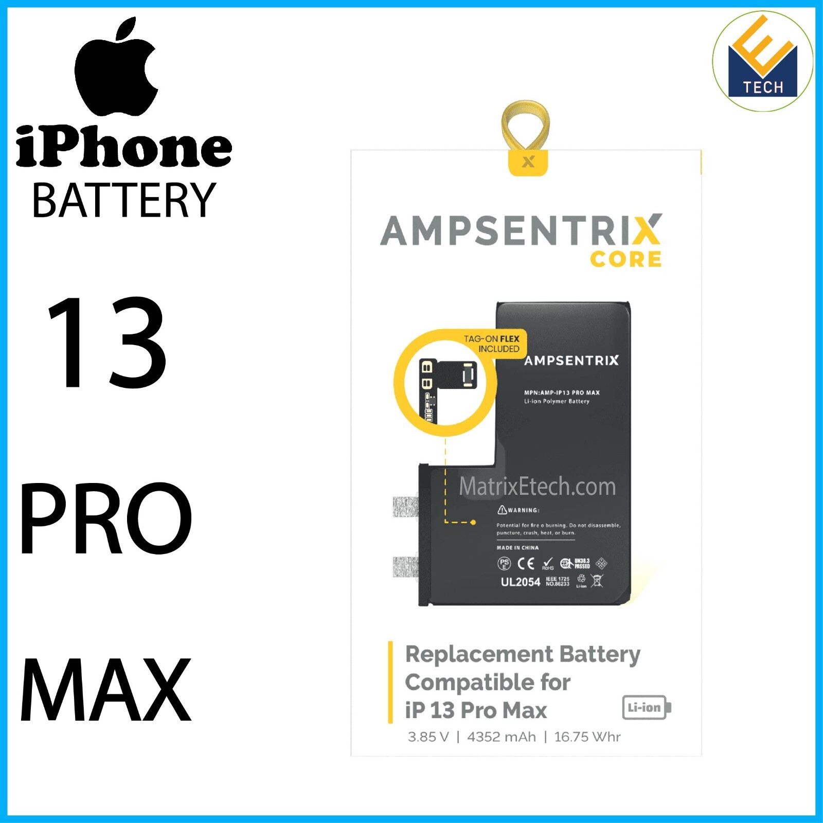 iPhone 13 Pro Max Replacement Battery Core with Universal Tag-On Flex (X Core) The iPhone 13 Pro Max Replacement Battery Core with Universal Tag-On Flex (X Core) is a black lithium-ion internal battery designed specifically for Apple's iPhone 13 Pro Max. It has a capacity of 4,352 mAh and features fast charging capabilities, making it ideal for users looking for a long-lasting battery solution. The battery is equipped with a Lightning port for connectivity and supports Qi wireless charging at 7.5W. Made in the United States, this standard version battery is compatible with the iPhone 13 Pro Max and offers reliable performance for users seeking a replacement option.