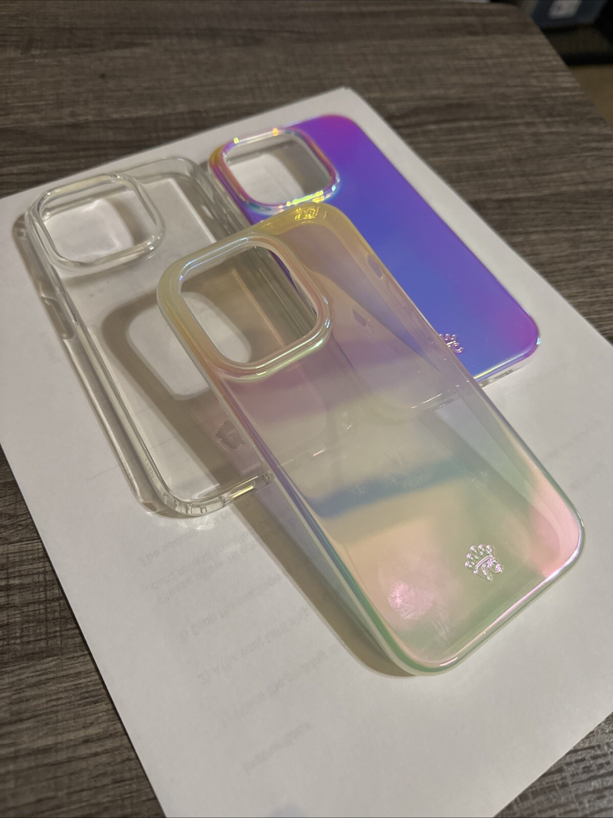 iPhone 14 Pro Velvet Caviar Cases. One clear, others are an iridescent. Very good excellent used condition. Will sell separate or will make bundle deals with other cases I have listed, just message me. Smoke and pet free home. As is.