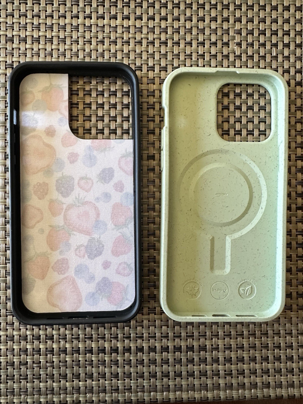 Lot of iPhone 14 Pro Max cases, used but in good condition. The Pela green sea turtle case is Biodegradable, so some of the specs in the design are due to it being made from recycled materials. The fruit patterned case has some scratches-see pictures for details. Thank you so much for looking!:)