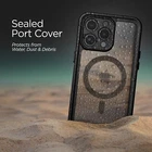 Titan Waterproof Case + Belt Holster for iPhone 15 Plus Built to survive any conditions. Elevate your phone�s defense with the fully submersible IP68-rated Titan Waterproof Phone Case for unparalleled protection against the elements. With a built-in screen protector, sealed port covers and a shock-resistant build, this case can withstand water, dirt, or mud and has been 15FT drop tested to provide you peace of mind when you need it most. Plus, enjoy the convenience of a belt clip holster and compatibility with MagSafe accessories. Rugged reliability meets modern functionality � the ultimate safeguard for your device. Locking Microphone Cover Say goodbye to muffled phone calls. The integrated mic cover opens effortlessly for phone calls or voice commands. When water protection takes priority, simply snap it shut. The best part? It locks securely in both open and closed positions, providing you with uninterrupted functionality and uncompromised security. Compatible with MagSafe Enjoy the convenience and simplicity of the magnetic ecosystem. Seamlessly connect to magnetic wallets, grips, mounts, power banks and more. Secure-Fit Belt Clip Holster The set includes a secure-fit companion belt clip holster to keep your phone conveniently at your side, with a secure-fit top locking design that makes inserting and removing your phone a breeze. The rotating belt clip provides the flexibility to wear your phone vertically or horizontally based on your preference. KEY FEATURES: Fully enclosed 2 piece design IP68 submersible rating 15FT drop tested Compatible with MagSafe accessories Locking microphone cover Built-in screen protector Belt holster included Rotating belt clip