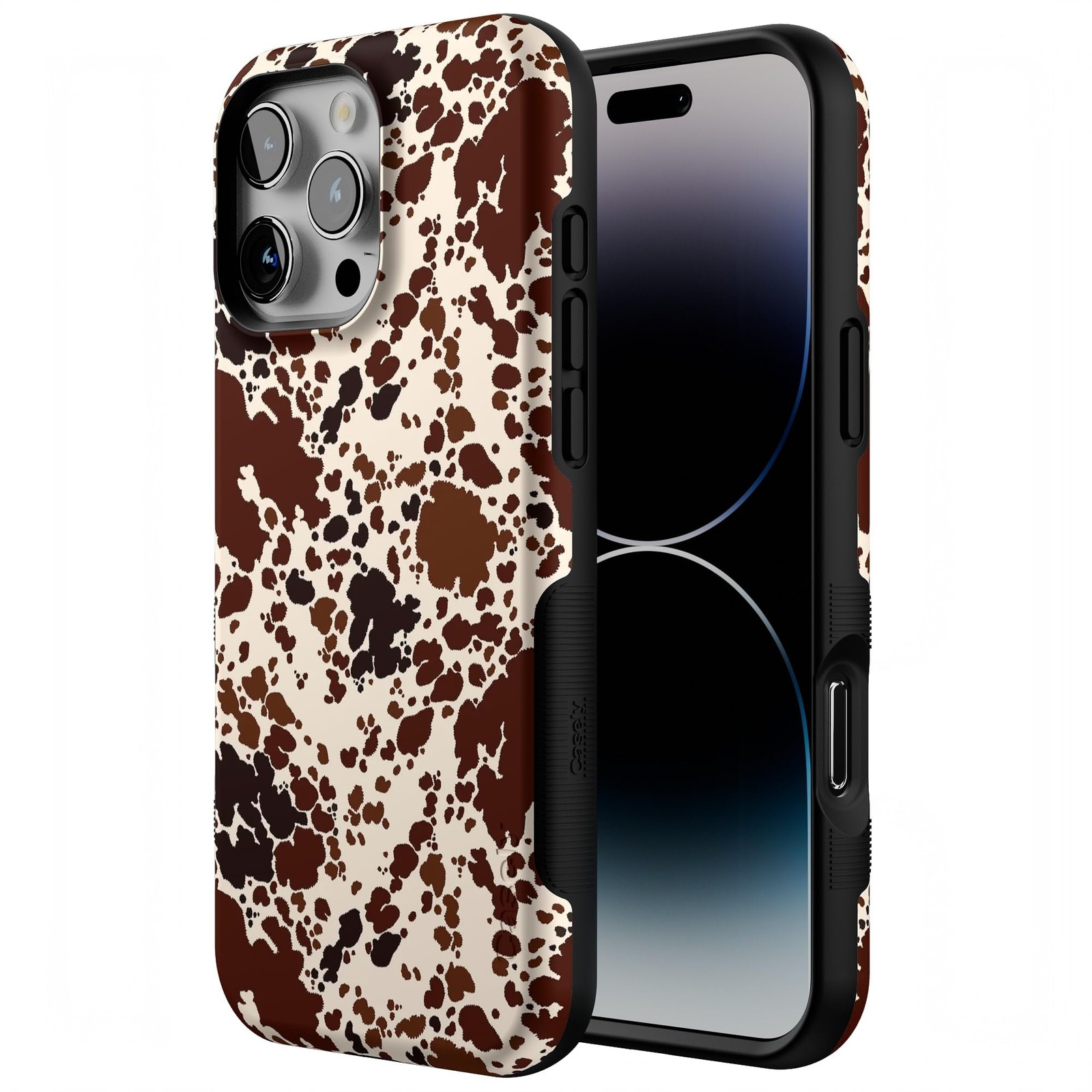 Product Page iPhone 16 Pro Cowgirl Envy Cow Print Case Military Grade Protection Stylish D... Description: Saddle up with the Cowgirl Envy Cow Print Case from our Concrete Jungle Collection. Bold, rustic, and effortlessly chic, this case brings the charm of the countryside straight to your phone, while keeping you ready for the fast-paced urban jungle. Featuring a striking cow print with rich brown and cream tones, this case is perfect for those looking to channel their inner cowgirl while staying on top of the latest trends. Whether you're exploring the city or dreaming of wide open spaces, this case is the perfect accessory to elevate your style. Designed with durability and function in mind, the Cowgirl Envy case is MagSafe compatible, ensuring easy charging while offering top-notch protection. Its sleek yet sturdy build makes it a perfect match for those who love to blend rugged elegance with everyday practicality. Whether you're kicking up dust or navigating the concrete jungle, make a statement with the Cowgirl Envy Cow Print Case - a must-have for anyone who loves a little wild west flair in their modern-day adventures. Features: Compatibility: Meet the Bold Collection - Not just a pretty cover for your phone, the Bold Collection Case from Casely is a super-strong Military-Grade-tested protective case, offering up to 8-feet of drop protection. Unique Features: Slip Resistant Side Grips. Stop drops in their tracks. Textured side grips help your phone firmly in your hand. Lightweight for Those on the Go: Don't carry a dumbbell around in your pocket. Ultra sleek, ultra slim. 3mm raised front lip protection. Weight: 1 Ounce. Protection: Shock absorbing air pocket technology cushions your phone from drops of up to 8 feet. Camera Protection: 1.5 mm raised lip keeps your camera safe from contact. Snap Crystal-clear pics every time. Charge Wirelessly: Go wireless. All Bold cases are wireless charging compatible. Designed in USA: Casely is one of very few case companies that designs our cases in the USA; All of our Phone Cases are designed in our Brooklyn, New York Headquarters Our Philosophy: We build protection for your Boldest behavior. #LiveBold. Casely's products are made with love and hand inspected from corner to corner to ensure high-quality phone cases you can count on. All cases come with a 1-year product warranty.