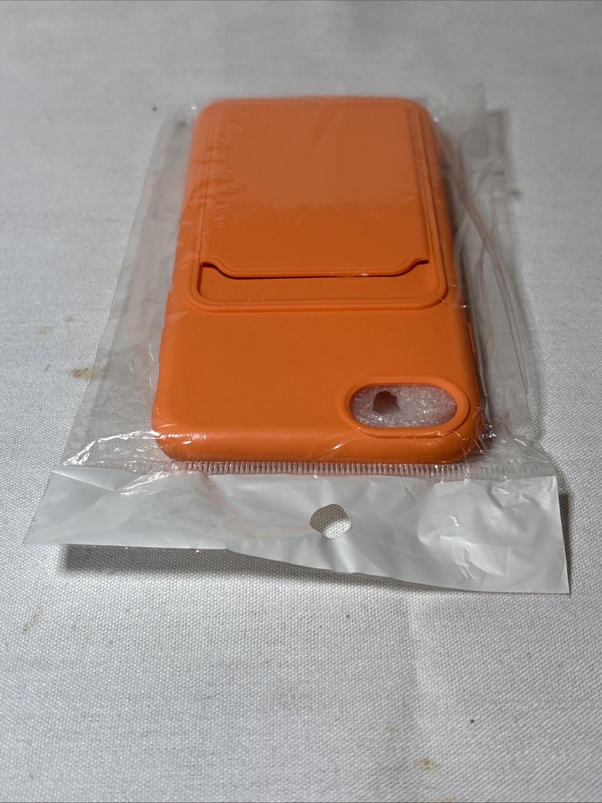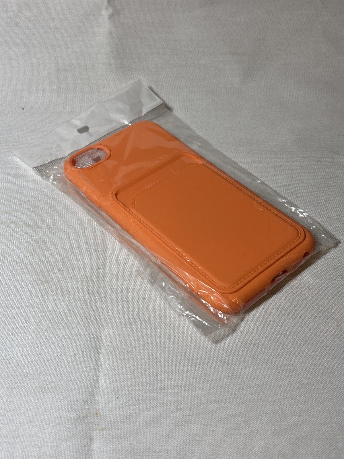 This is an orange salmon wallet case designed for the Apple iPhone 7, featuring a Mr. Mosby theme. The case is made of a silicone rubber mixture with a matte finish, and it has a card holder for convenience. With dimensions of 6 inches in height, 3 inches in length, and 0.2 inches in width, this lightweight case weighs 1 oz. Perfect for women looking for a stylish and functional option to protect their iPhone 7 while also carrying cards.