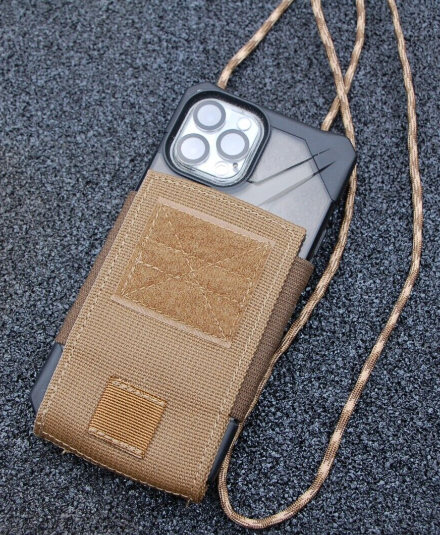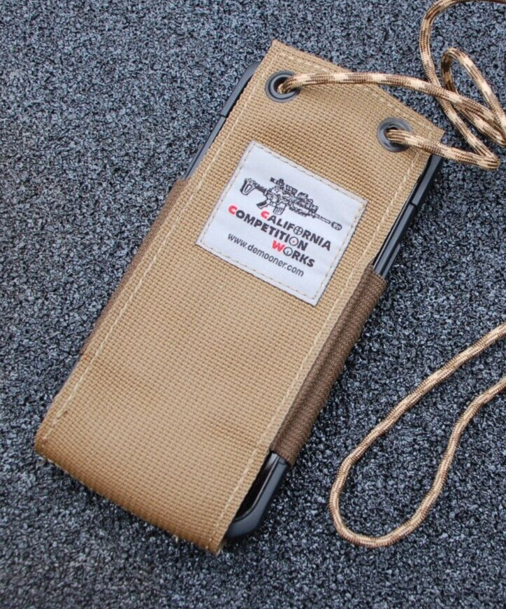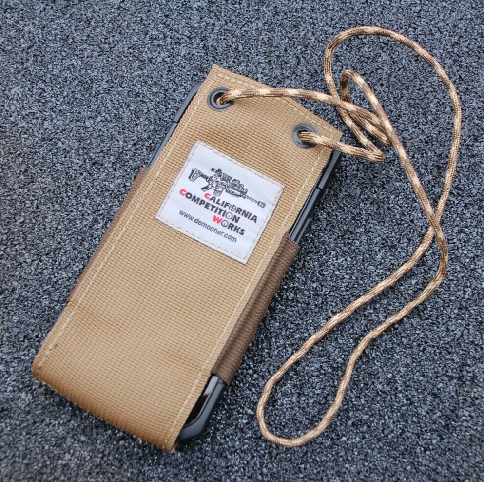 iPHONE NECK POUCH BY CALIFORNIA COMPETITION WORKS, DESERT TAN, MADE IN USA, NEW, SEE PICTURES FOR DESCRIPTION HAS A 2" SQUARE OF VELCRO LOOP FOR A MORALE PATCH CAN BE USED TO TALK HANDS-FREE THERE WERE VERY FEW OF THESE MADE (I BELIEVE ONLY ABOUT 60) AND I ONLY SOLD THEM AT THE ORANGE COUNTY GUN SHOW US MADE WITH US MADE MATERIALS IN EL MONTE, CA SEEMS LIKE IT'S A LITTLE BIT TIGHT FOR AN iPHONE 12 PRO MAX AND WOULD BE A BETTER FIT WITH THE STANDARD SIZED iPHONE OR AN iPHONE PRO iPHONE 12 PRO MAX IS NOT INCLUDED