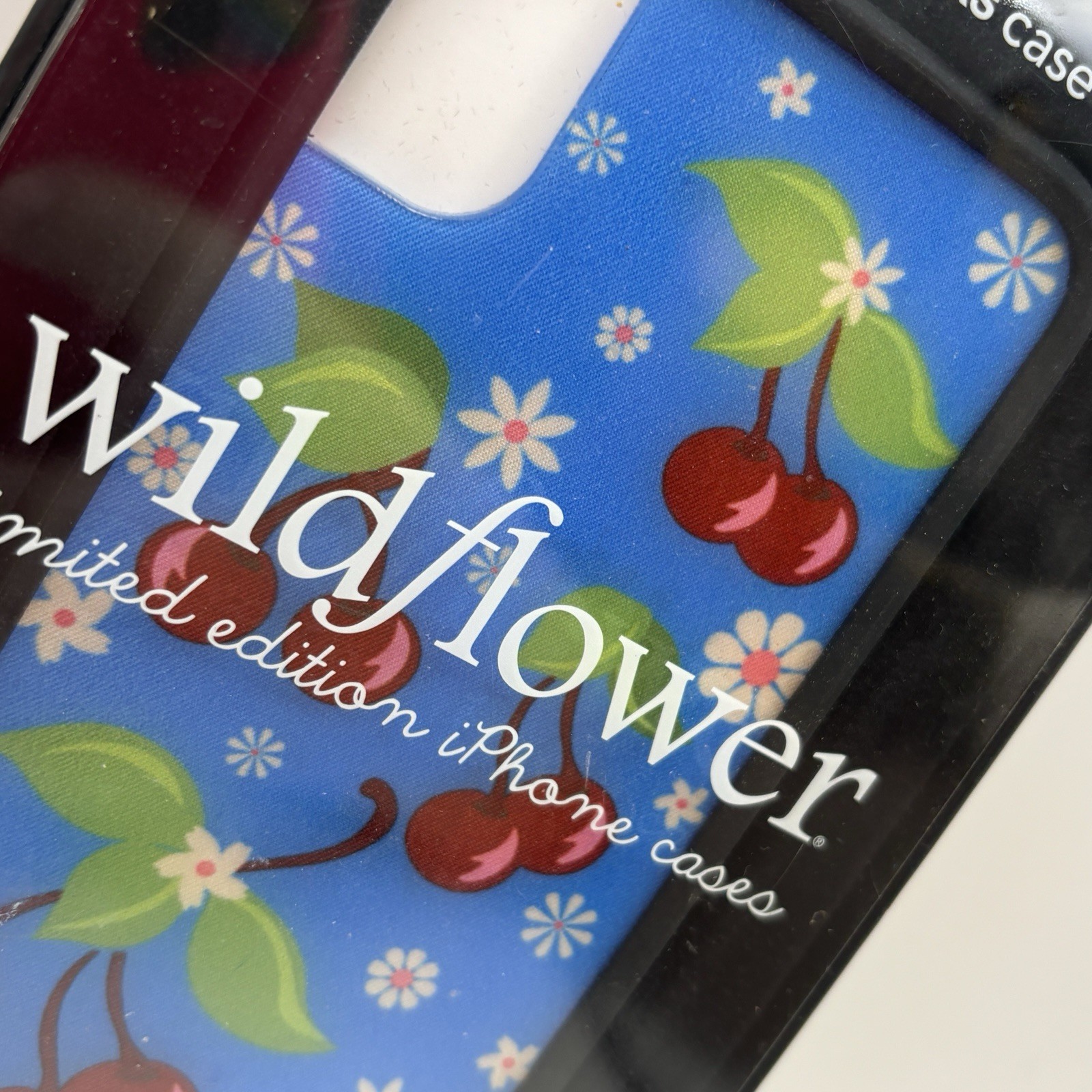 Protect your iPhone X or XS with this limited edition Wildflower Cherries blue cell phone case. The glossy finish and multicolor design featuring cherries and daisies make this hard case a perfect accessory for your phone. Crafted from durable polyurethane material and made in the United States, this bumper type case comes brand new in its original box. It includes a hard case for your phone and is compatible with Apple iPhone X and XS models. Add a touch of style to your phone with this unique and chic case. New in box!
