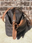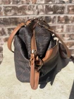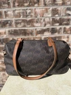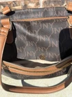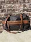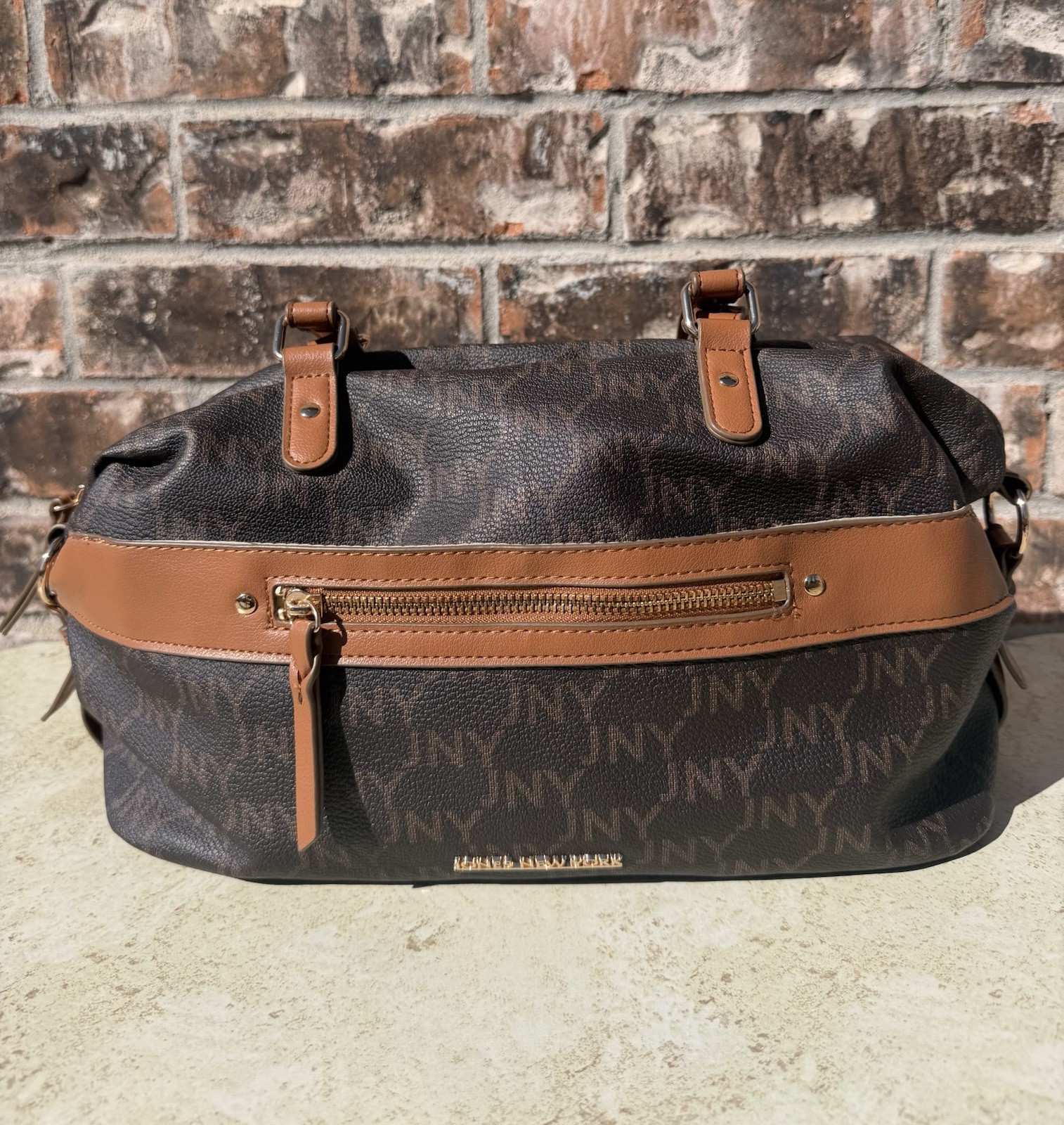 Jones New York Bag dark brown "JNY" patterned body with tan/cognac vegan leather trim and dual top handles. two scratches on the internal handles