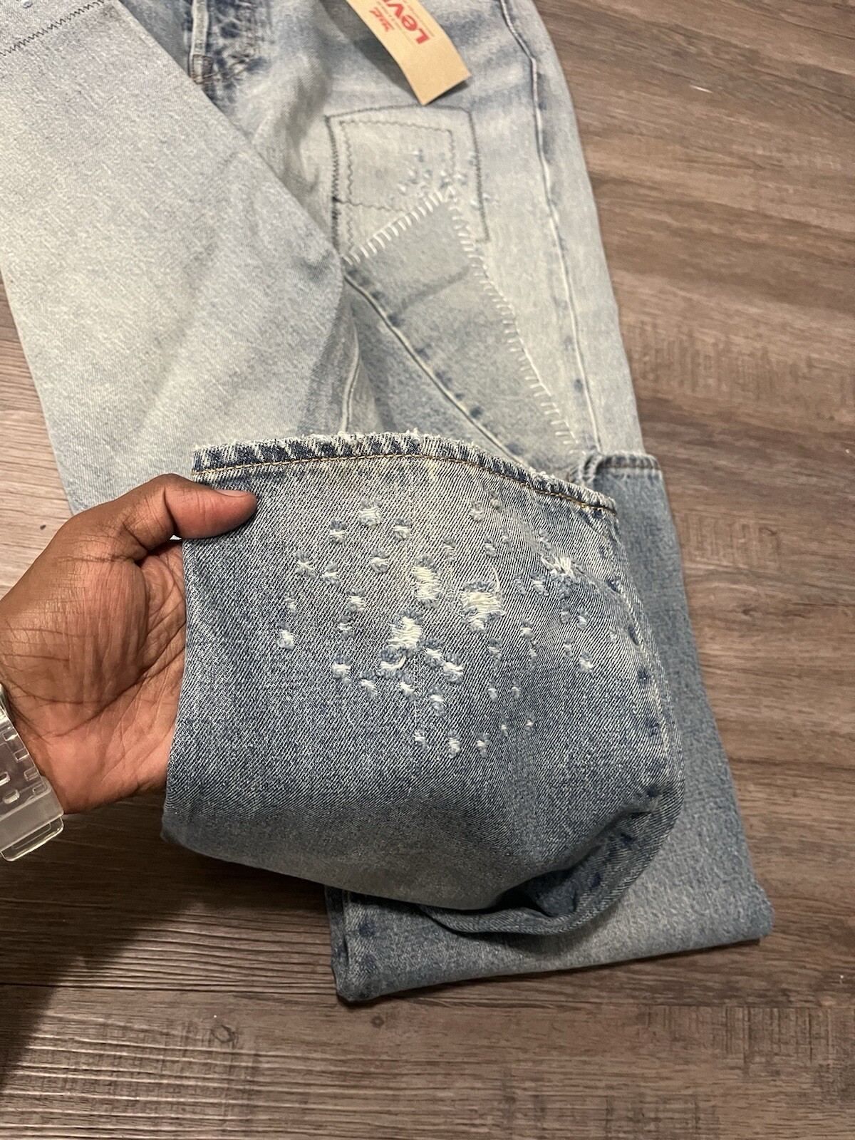 Elevate your denim game with these Levi's 501 Selvedge Patchwork Jeans. The unique design, made from repurposed selvedge fabric, adds a touch of nostalgia to your wardrobe. The regular fit and size 32 waist make them suitable for any occasion. Crafted by Levi's, a brand known for their quality and durability, these jeans are a must-have for any denim enthusiast. The model number Levi's 501 ensures that you are getting a classic and timeless product. Perfect for men who appreciate style and comfort, these jeans belong in every wardrobe.