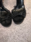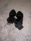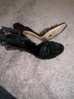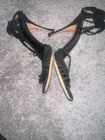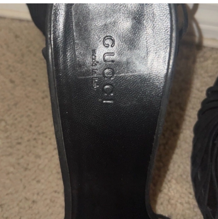 These are Gucci women's heels in size 10.5. They feature a black suede material with a strappy design and a peep toe style. Made in Italy, these sophisticated heels are perfect for adding a touch of luxury to any outfit.gently loved condition no damage or wear marks