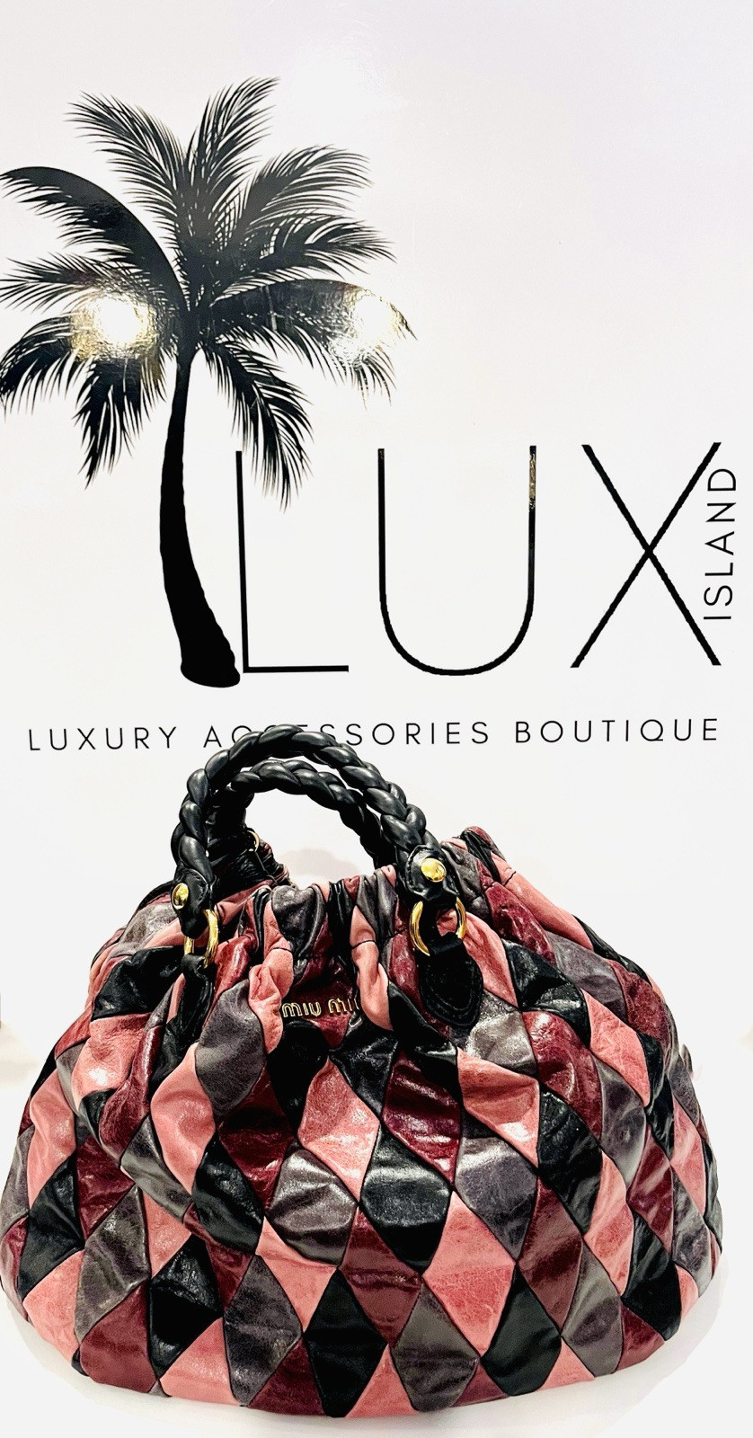 MIU MIU Bag Style Harlequin Color(s) Pink • Purple • Grey • Black Material Leather Print Diamond Pattern Hardware Gold Tone Accent(s) MIU MIU Logo • Braided Leather Handles Approx 13.5” H x 18” W x 4.5” D Approx Handle Drop 3” Made in Italy $1595 MIU MIU Price $700 LUX ISLAND Price As is. All Purchases are FINAL. No Returns, Requests nor Exchanges. LUX ISLAND Luxury Paradise for Fashionistas
