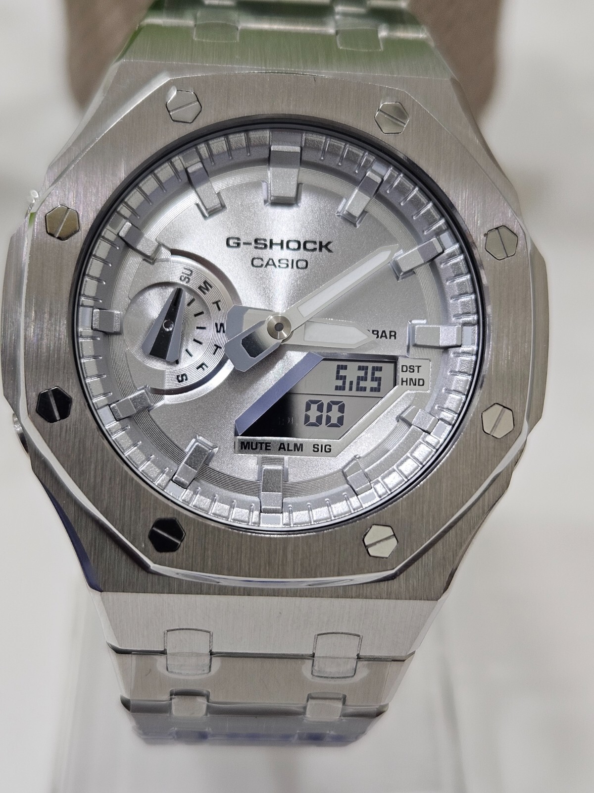 This is a professionally modified Casio GA-2100 watch, inspired by the iconic CasiOak style. Built on a 100% authentic G-Shock base, this custom timepiece features upgraded parts and a unique design for collectors and enthusiasts. Key Features: Original Casio GA-2100 base Custom-modified bezel, dial, and strap 20-bar water resistance (same as original) Shock-resistant and durable build Analog-digital hybrid display Comes in G-Shock box Important Note: This is a custom-modified product. Casio is not affiliated with, nor does it endorse, these modifications. All changes have been made by independent watch modders. Perfect for: G-Shock lovers Watch collectors Streetwear enthusiasts Unique gift ideas