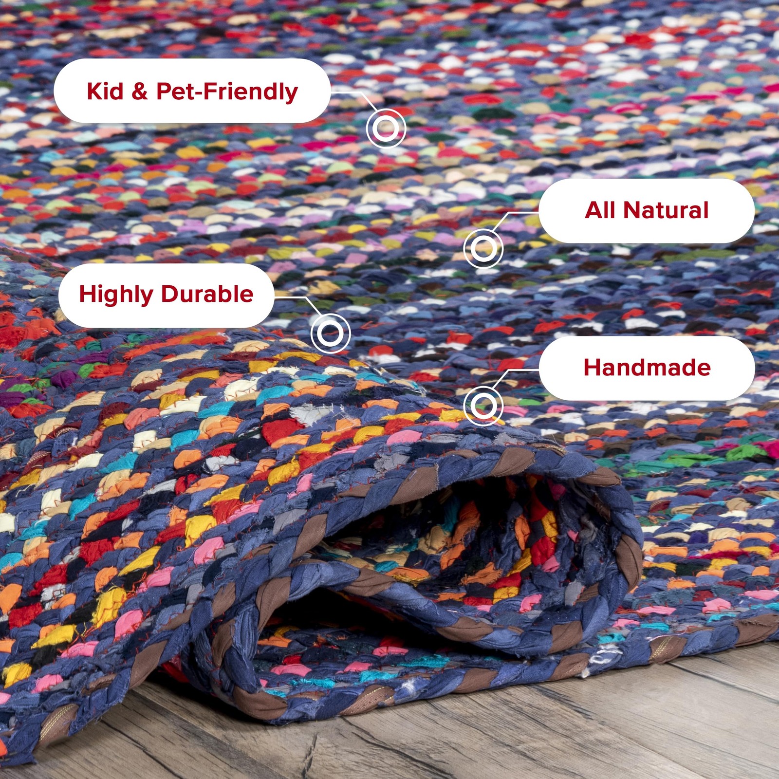 100% Cotton, made in India Refreshingly lightweight cotton rugs are perfect for dining room, living room, kitchen, entryway, bedrooms, and best when sheltered from direct sunlight Sleek and functional 0.35" thickness allows for convenient placement in entryways and underneath furniture Handmade rugs should be treated more carefully than machine-made rugs. We recommend shaking out dirt or debris and spot treating mild stains We recommend using a rug pad to provide extra cushioning and to prevent any possible slipping and sliding on your flooring. Rug pads serve as protective layering piece for your floor and your rug from any wear and tear, extending the life of your rug
