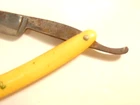 Here is a pre-owned old straight razor marked "Rattler" on the face of the blade and Germany near the rivet. The blade is also labeled "Welliver Hardware Co. Danville, PA". It measures about 6 inches long. The blade measures about 5 1/2 inches long and is about 5/8th inches wide. The razor shows some wear on the blade including staining and light corrosion on the blade and dirt on the yellow handle. Please see the pictures and ask any questions. Thank you for looking. (Inv 23,115)