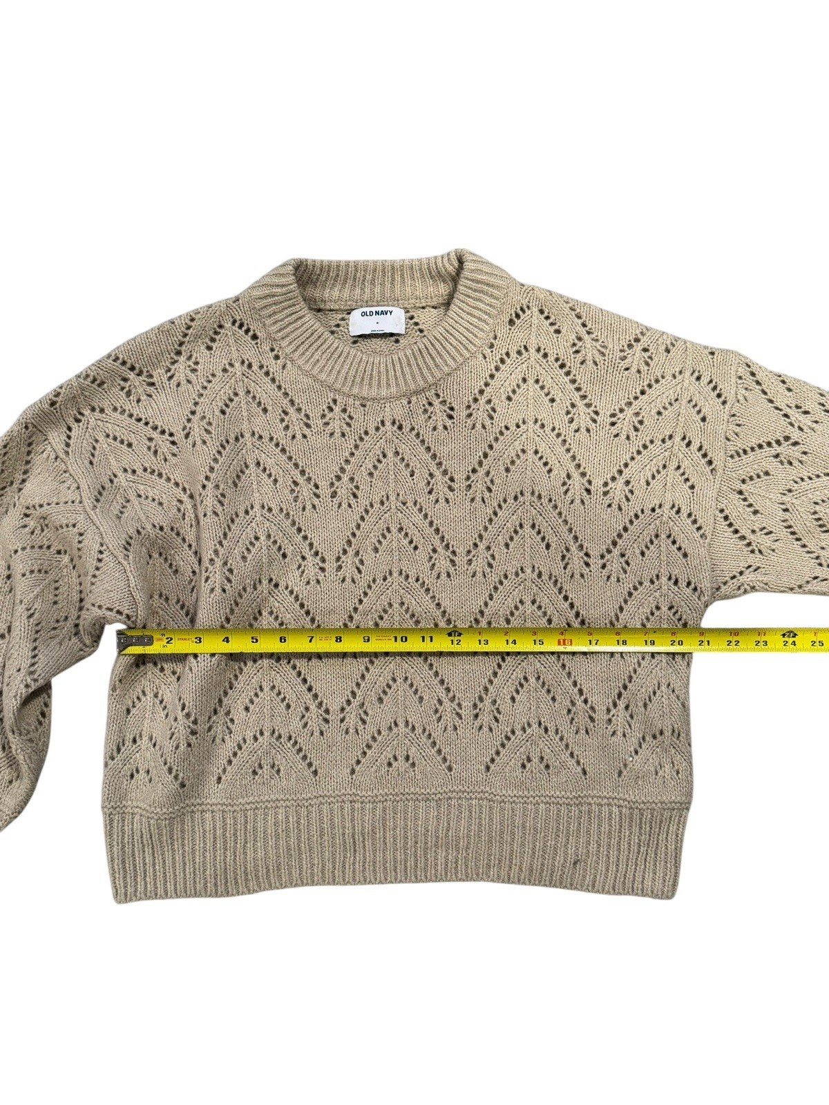 The product is an Old Navy women's sweater in a medium size, featuring a tan pullover style. It is a nitted sweater, making it warm and comfortable for cooler weather. The sweater is designed for regular sizing and is perfect for adding a cozy touch to any outfit.