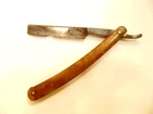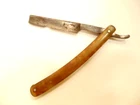 Here is a pre-owned older straight razor labeled "The Peach" on one side of the blade and "A. Ferschke, Solingen, Germany" on the opposite side. The razor has a brown handle or scales. The blade centers well. The razor measures about 6 inches in length and the blade measures 5 3/8th inches from end to end. The blade is about 9/16th inches wide. The razor shows wear and a crack on the handle. There is also some tarnish, dirt, wear and a chip on the blade. Please see pictures and ask any questions. Thank you for looking. (Inv 25,230)