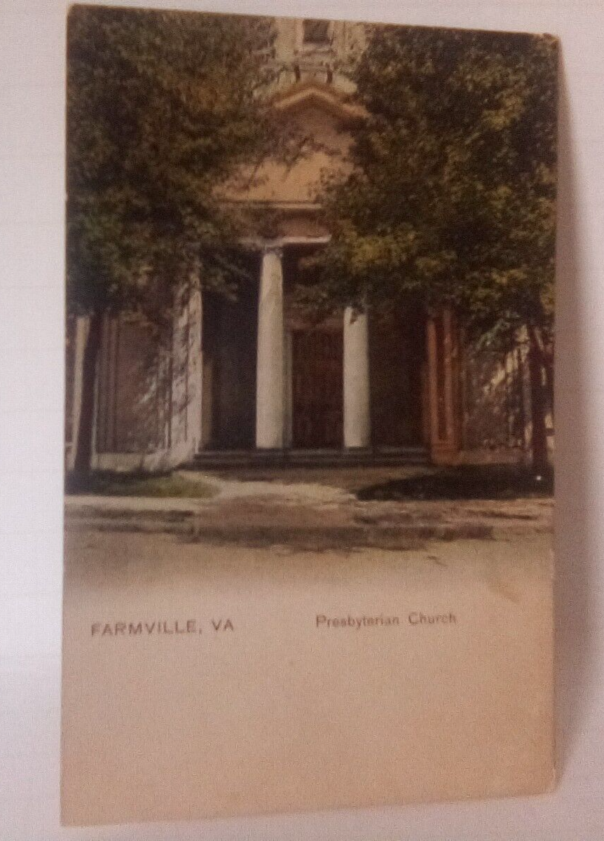 This is a printed (lithograph) postcard featuring the Presbyterian Church in Harrisonburg, Va., United States. The postcard is an original piece from Germany, showcasing the architecture and religious theme of the church. It is a single unit for sale, depicting a topographical view of the church.