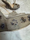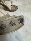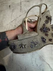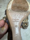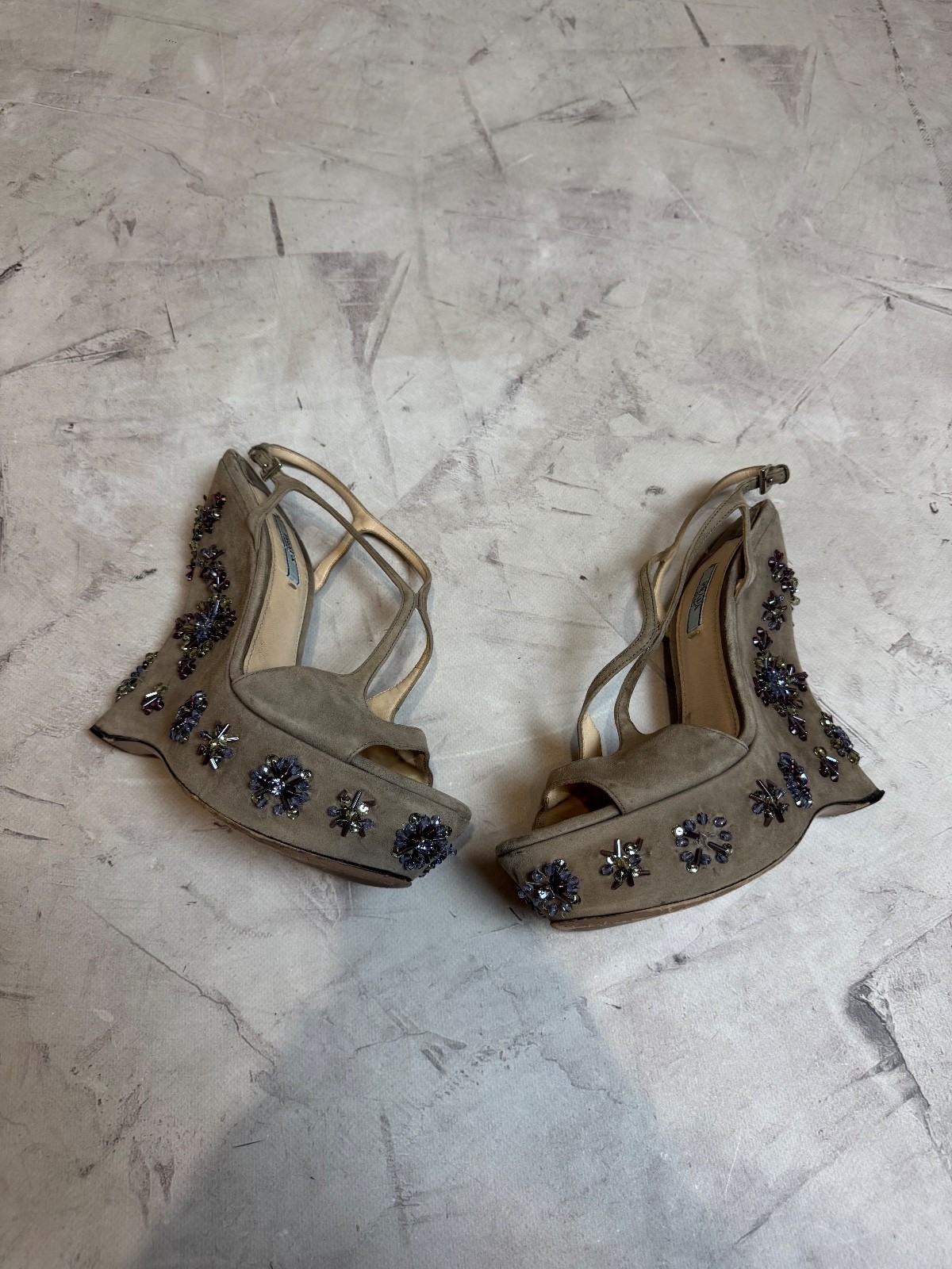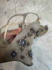 The Prada jeweled wedge suede sandals are stylish and elegant women's shoes perfect for a casual occasion in the summer season. Made in Italy, these sandals feature a solid grey color with a strappy design, leather lining, and suede upper material. The wedge heel adds a touch of sophistication to the overall look, making them a versatile choice for any fashion-forward woman's wardrobe.
