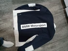 This PUMA hoodie in size XL features a full zip closure with a drawstring hood and pockets. It is dark blue with white accents, including a zipper and logo details. The design is inspired by BMW, incorporating a cars and colorful theme. The garment is machine washable and made in China.