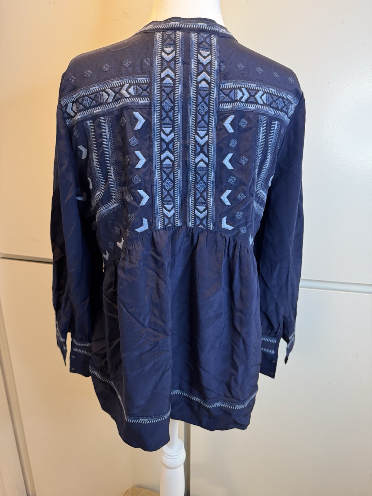 This Rebecca Taylor silk embroidered navy blouse features a V-neckline, pullover closure, and snap cuffs for a stylish and unique touch. Made from chiffon fabric, this blouse is perfect for various occasions such as travel, parties, casual outings, and workwear. The geometric embroidery adds a bohemian flair to the basic style, making it suitable for all seasons and with its breathable silk material, it is comfortable to wear in the summer, fall, and spring. The designer brand, bohemian theme, and peasant-inspired details make this blouse a fashionable choice for women size 6 looking for a versatile and chic addition to their wardrobe.