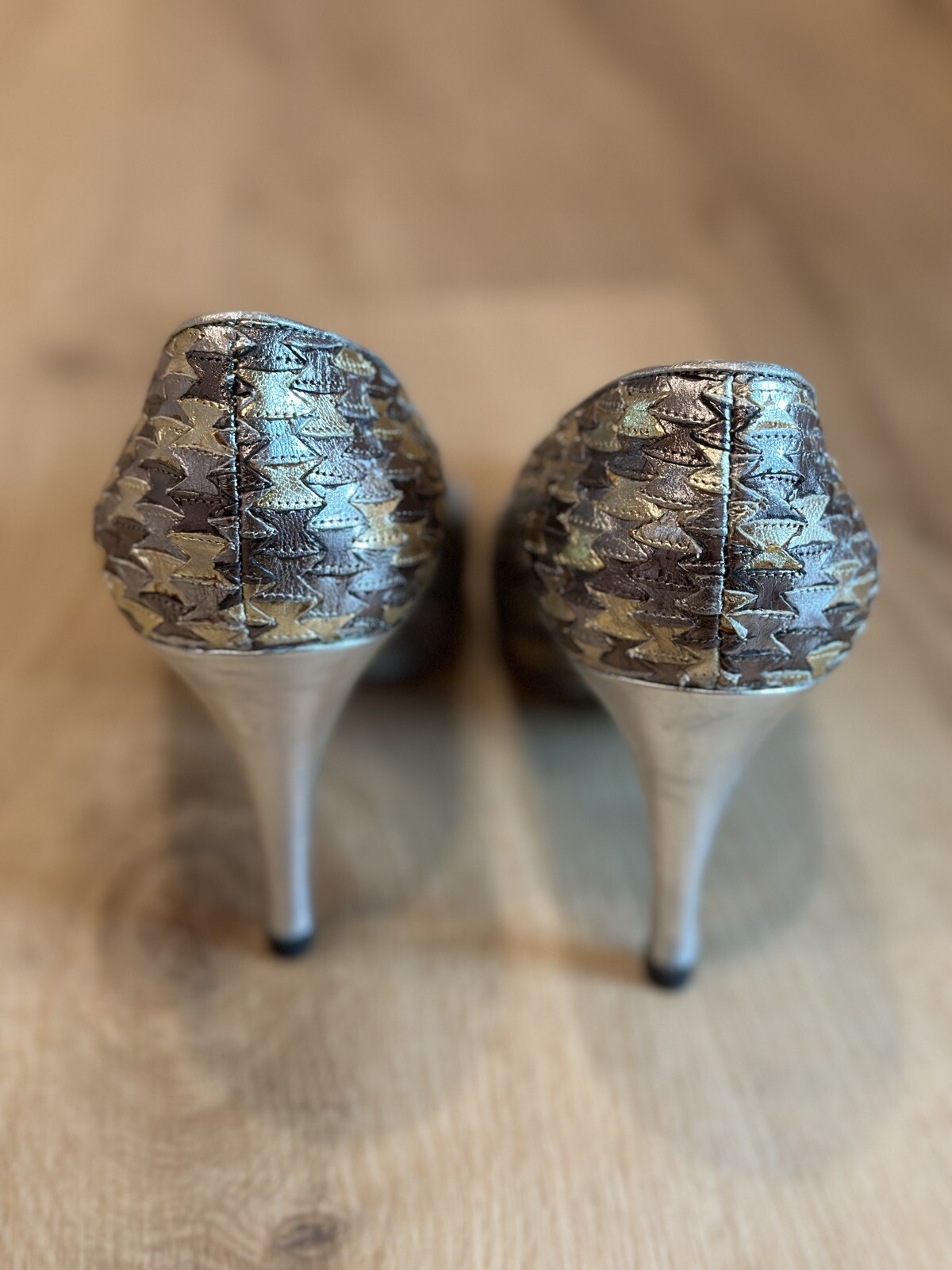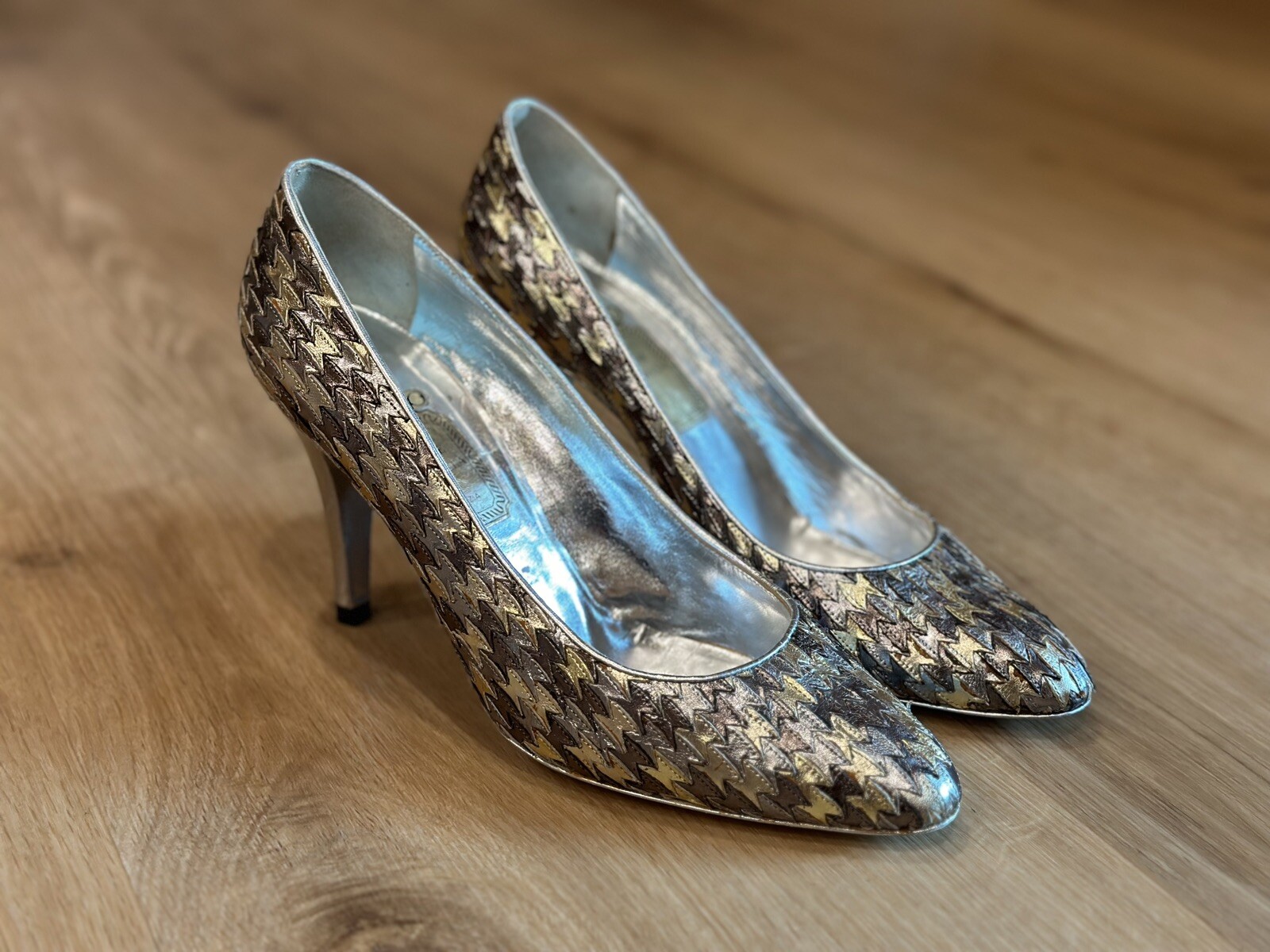 Elevate your shoe game with these stunning René Caovilla pumps in gold and silver. The woven pattern and almond toe shape add a touch of elegance, while the slip-on closure makes them easy to wear. These pumps feature a high stiletto heel, measuring between 3-3.9 inches, making them perfect for any formal occasion. Crafted with leather upper material and a standard shoe width, these pumps are suitable for all seasons, including winter, summer, fall, and spring. The metal theme and branded Gold character add a unique touch to these pumps, making them a must-have for any fashion-forward woman. Available in size 39, these pumps are sure to make a statement wherever you go.