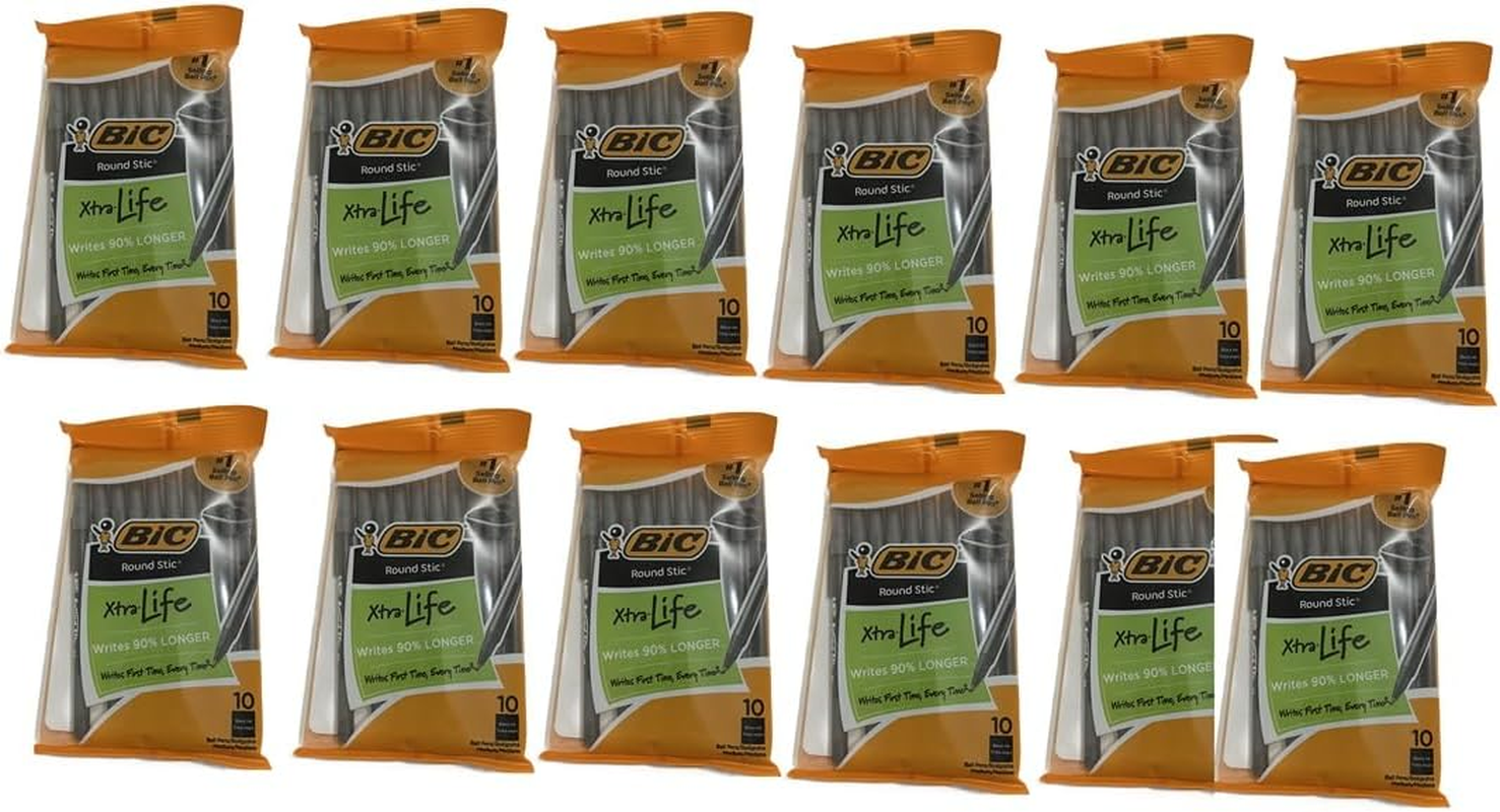 One 10-count pack of BIC Round Stic Xtra Life Black Ballpoint Pens Versatile 1.0mm medium point tip creates clear lines for note-taking, sketching or writing lists Tungsten carbide ball spreads the black ink smoothly and evenly Pack of pens with a round, comfortable barrel design Long-lasting black ink writes first time, every time Combine exceptional performance and longevity with BIC Round Stic Xtra Life Black Ballpoint Pens. The flexible 1.0 mm medium point pens deliver crisp, legible lines, making these black ink pens a superb choice for everyday writing activities. BIC Round Stic Xtra Life Black Pens are the ideal smooth pens for writing — minimizing blotting and skipping as the tungsten carbide ball helps the black ink spread evenly. BIC Round Stic Pens have translucent, flexible round barrels that let you see how much ink remains. The matching cap includes a handy clip for easy attachment to pockets or notebooks. Write the first time, every time with BIC Round Stic Xtra Life Black Ballpoint Pens — the No.1 selling ballpoint pen*. Each black ink pen in this pack writes 90 percent longer compared to Paper Mate InkJoy 100 Ball Stick Pen**, providing a cost-effective option when restocking office supplies. *Source: The NPD Group/ U.S. Retail Tracking Service/ Actual Unit Product Line Sales (Retail and Commercial Combined)/ Annual 2020). **Paper Mate and InkJoy are trademarks of Newell or an affiliate. Newell has not sponsored or approved and is not affiliated with this BIC branded product.