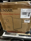 Runsail tankless water heater for RV. Propane, 12 volt, remote control, digital readout, 65,000 BTU, black in color.