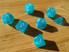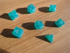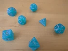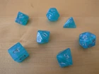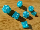 set of 7 dice, semi-transparent blue shimmer with silver numbers