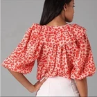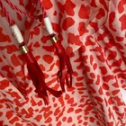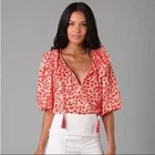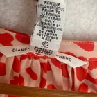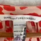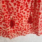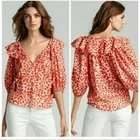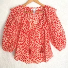 Diane Von Furstenberg "keoni ruffle" puff sleeve red speckled boho blouse top red/orange animal print, notch neck, ruffle collar, tassel detail. Pristine, like new. Has been dry cleaned. No fade, stains, wash wear, etc. armpit width 19" length: 25" boho, balloon sleeve, animal print, diane von furstenberg, ruffle neck, v-neck, tassels, red, orange, relaxed fit, designer, size 8, blouse, top, designer top, designer blouse