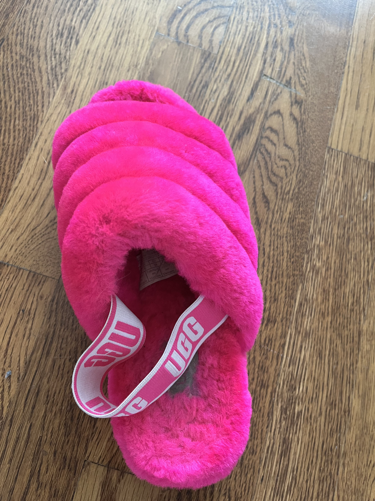 UGG Pink Fluffy Slippers – Cozy Plush Indoor Slippers Super cute and cozy UGG slippers in a bright pink color. These slippers feature a soft, plush faux-fur lining and footbed for warmth and comfort. The elastic strap with UGG logo helps keep them secure while wearing. Perfect for lounging around the house. Details: Brand: UGG Color: Bright pink Style: Slip-on indoor slippers with elastic logo strap Material: Plush/faux fur lining Condition: Pre-owned (see photos for exact condition) Great for everyday comfort, gifting, or relaxing at home. Please review all photos carefully before purchasing.
