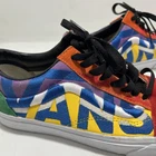 The product is a pair of VANS sneakers in a multicolor design, specifically sized as a men's 9 and a women's 10.5 . These athletic shoes have a colorful theme and are perfect for men looking for a stylish and comfortable sneaker option. The brand VANS is known for its trendy and versatile footwear, making these sneakers a great addition to any outfit. like new condition worn once that’s it super clean.