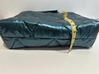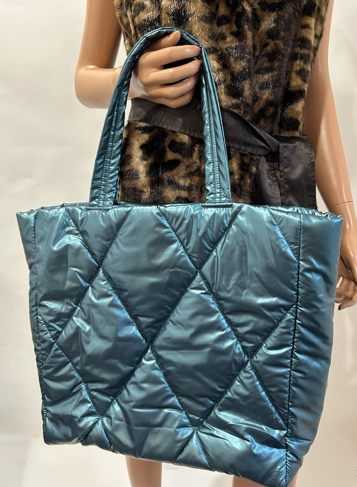 The Victoria's Secret Quilted Bag in metallic green is a large tote bag perfect for travel and casual occasions. It features a square shape with double green handles, a quilted finish, and a lightweight design. The bag is made of nylon with a polyester lining, making it durable and easy to carry. This limited edition bag includes a brand card and is part of the Victoria's Secret Weekender collection, adding a touch of luxury to your everyday style. Perfect for those who love a touch of glam in their accessories.